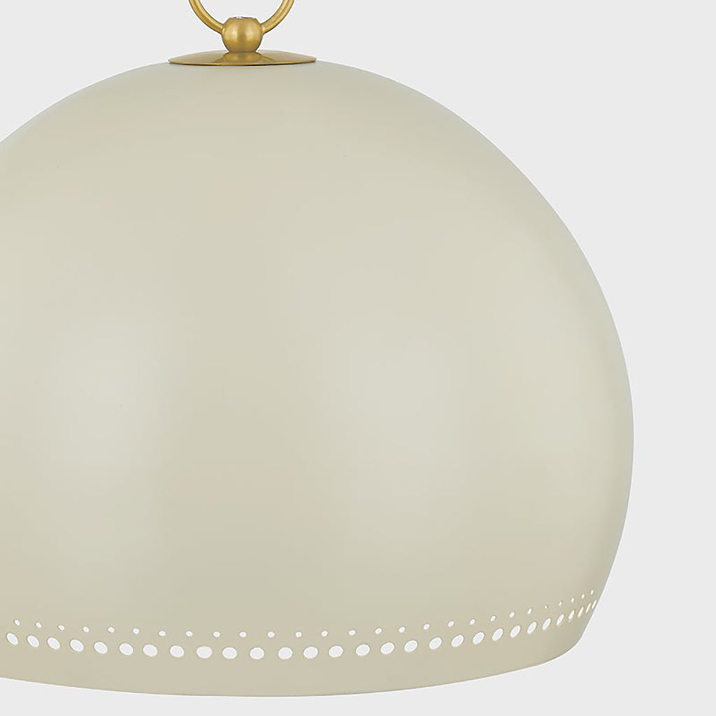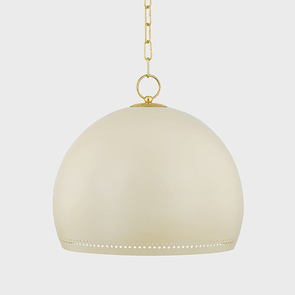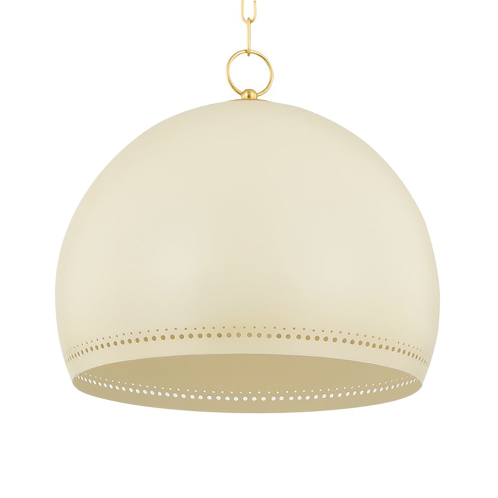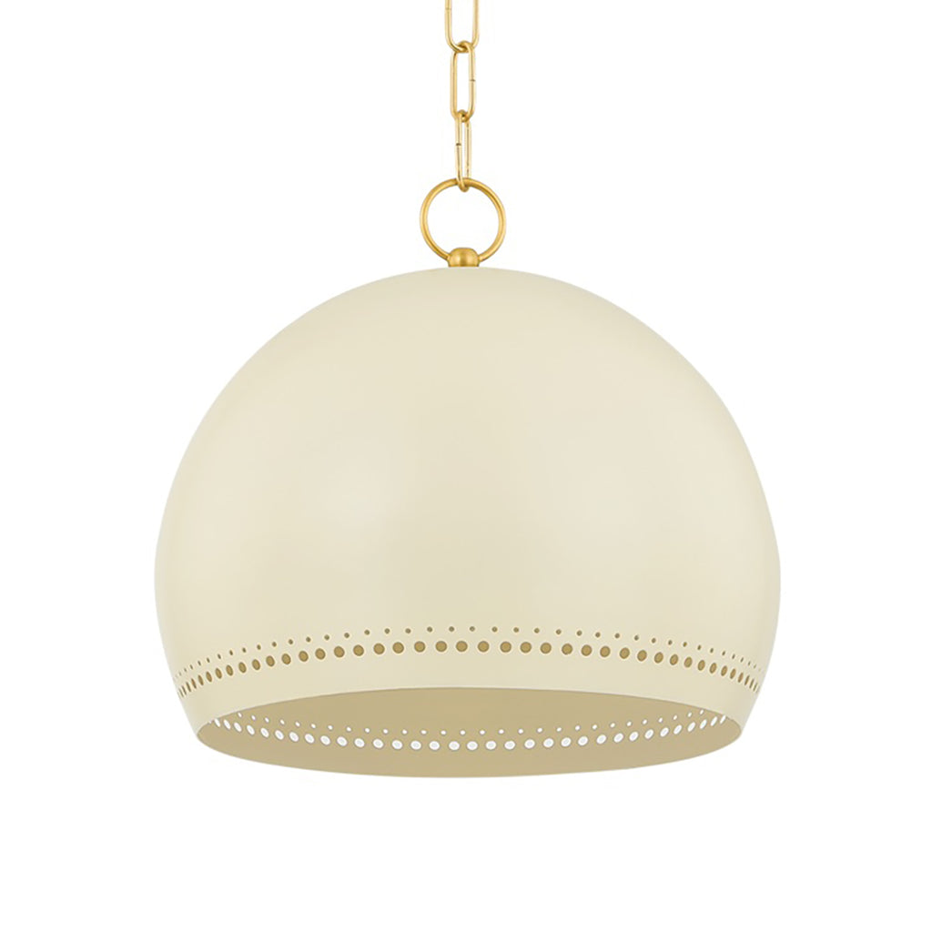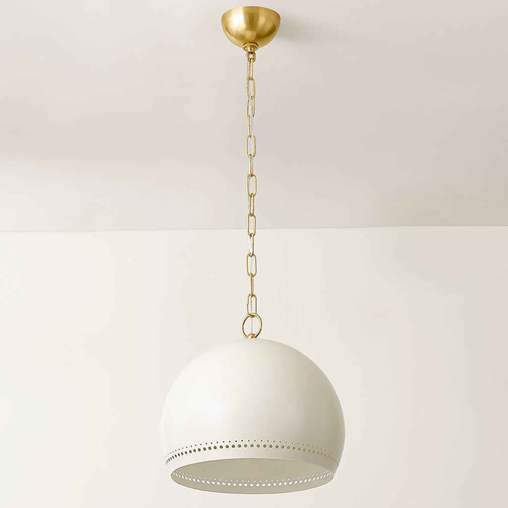 The simple silhouette of Mitzi Etna Pendant is punctuated by design details that create an elevated, chic lighting experience. A glossy Soft Cream hue is painted on the shade and emanates a warm glow from within. Delicate circular perforations allow light to filter through, casting unique shadows that play across the walls of the room. Available in two sizes, Etna will light up a kitchen, breakfast nook, or other desired area.