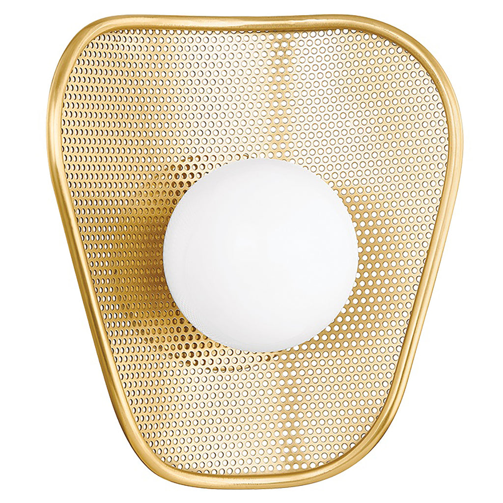 A modern take on vintage silhouettes, Mitzi Marta Wall Sconce is a striking conversation piece. The graphic composition of this sconce includes a curved perforated metal form finished in Aged Brass. Rippled edges create a shell-like shape, while the opal shiny glass orb at the center resembles a pearl. This fun accent light is perfect for any space.