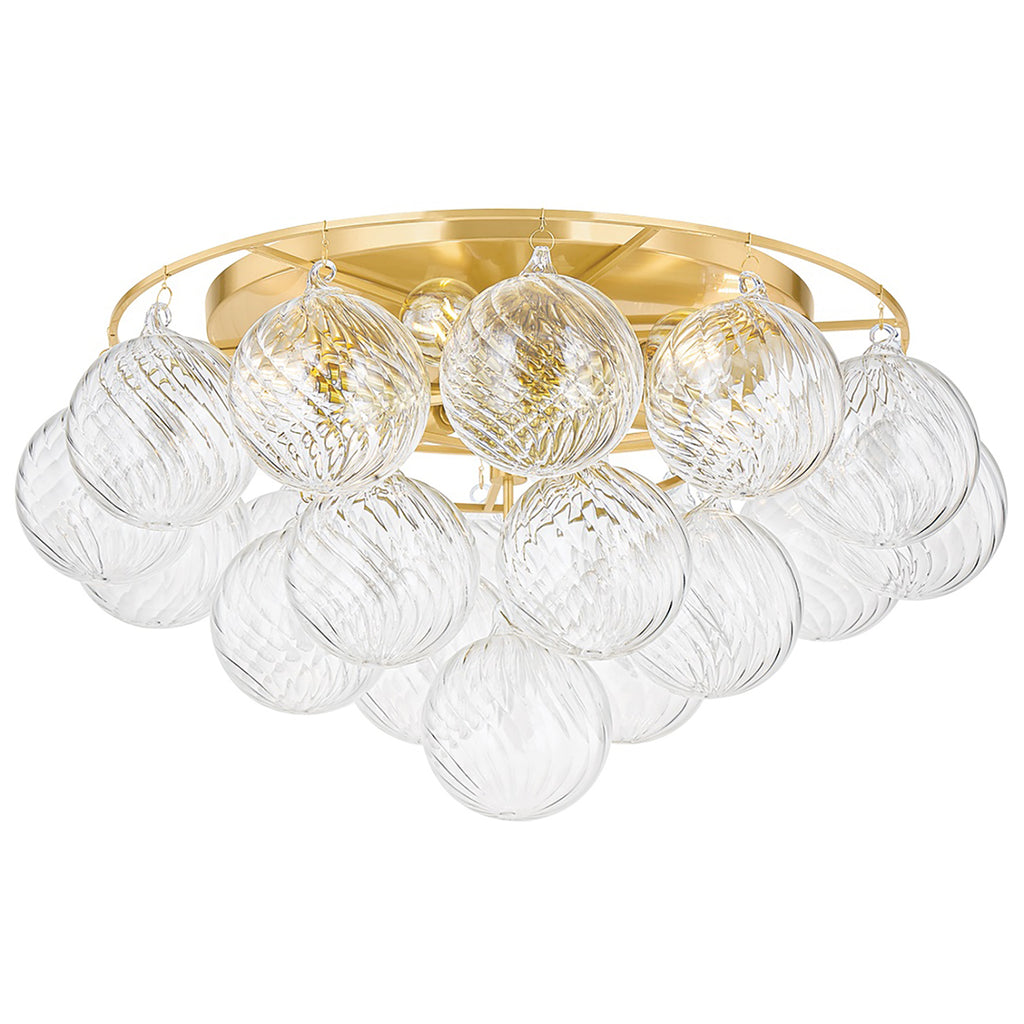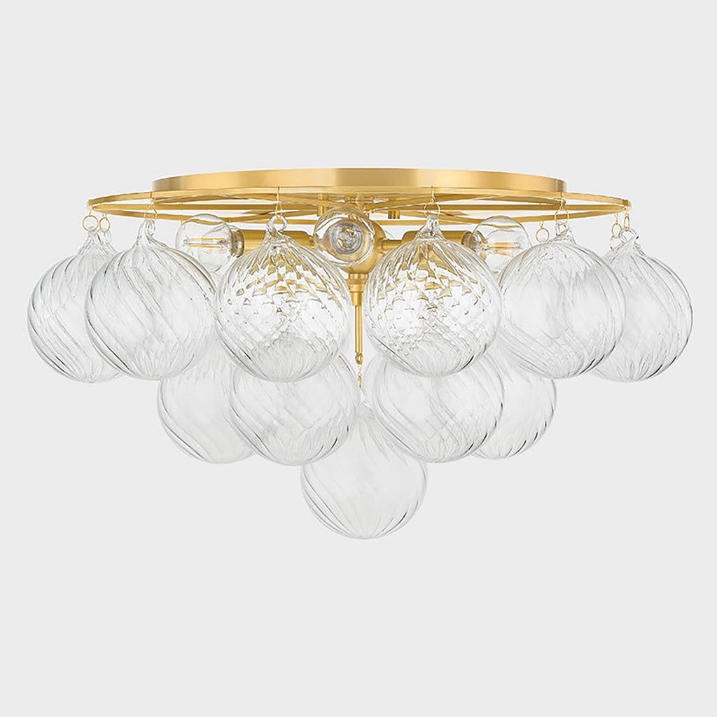 Swirl-ribbed or plated champagne glass globes dangle from an Aged Brass frame, creating this cloud-like showstopper. Whether you’re dressing up a breakfast nook with the small chandelier, adding a soft glow to an entryway with the flush mount, or making a glam statement in your dining room with the large chandelier, the possibilities for Mitzi Mimi are endless. Part of our Megan Molten x Mitzi Tastemakers collection.