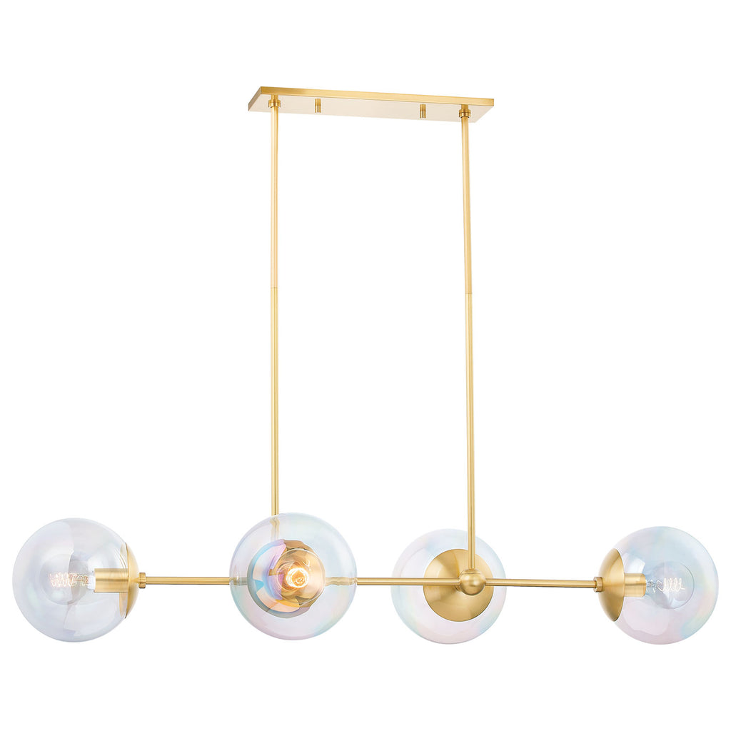 High-quality and exceedingly creative, Mitzi delivers a semi-nostalgic classic lighting collection with streamlined contemporary elements that instantly upgrade your space. The Mitzi Ophelia is forward-thinking and fun. The combination of aged brass and iridescent glass globes is otherworldly, lending a softness to the wall sconce, island light, and chandelier.