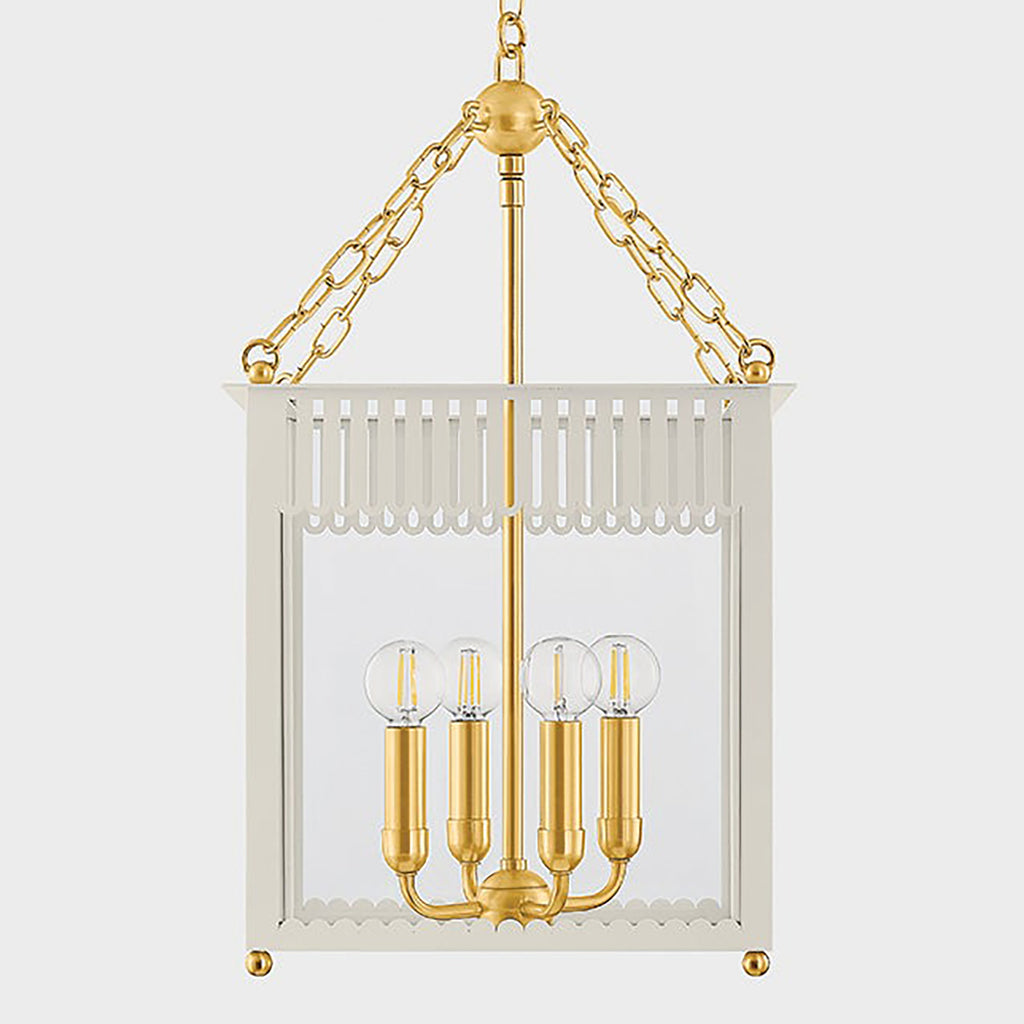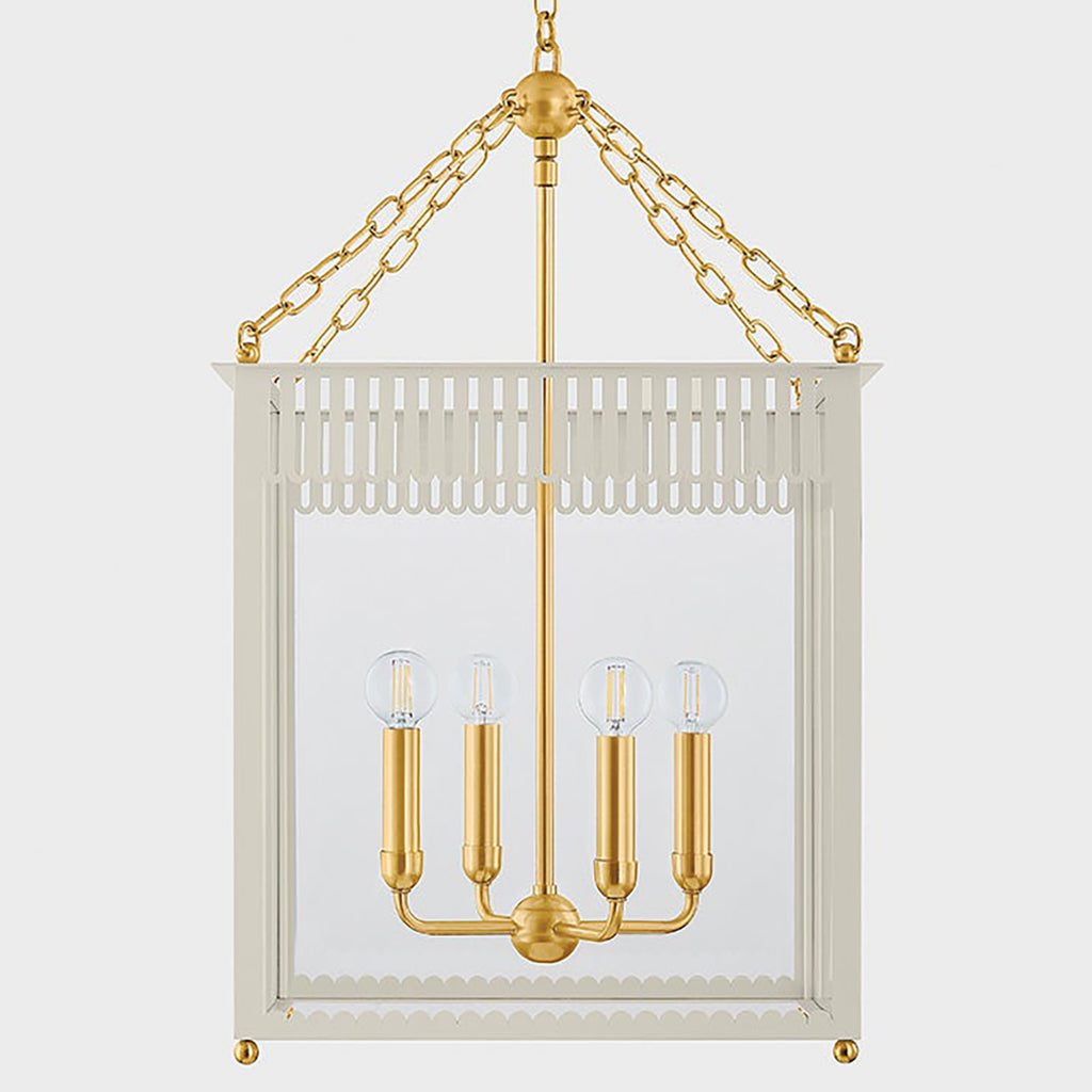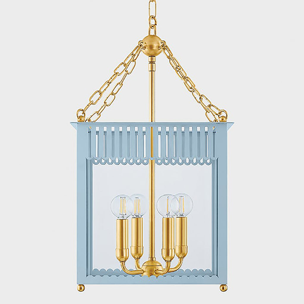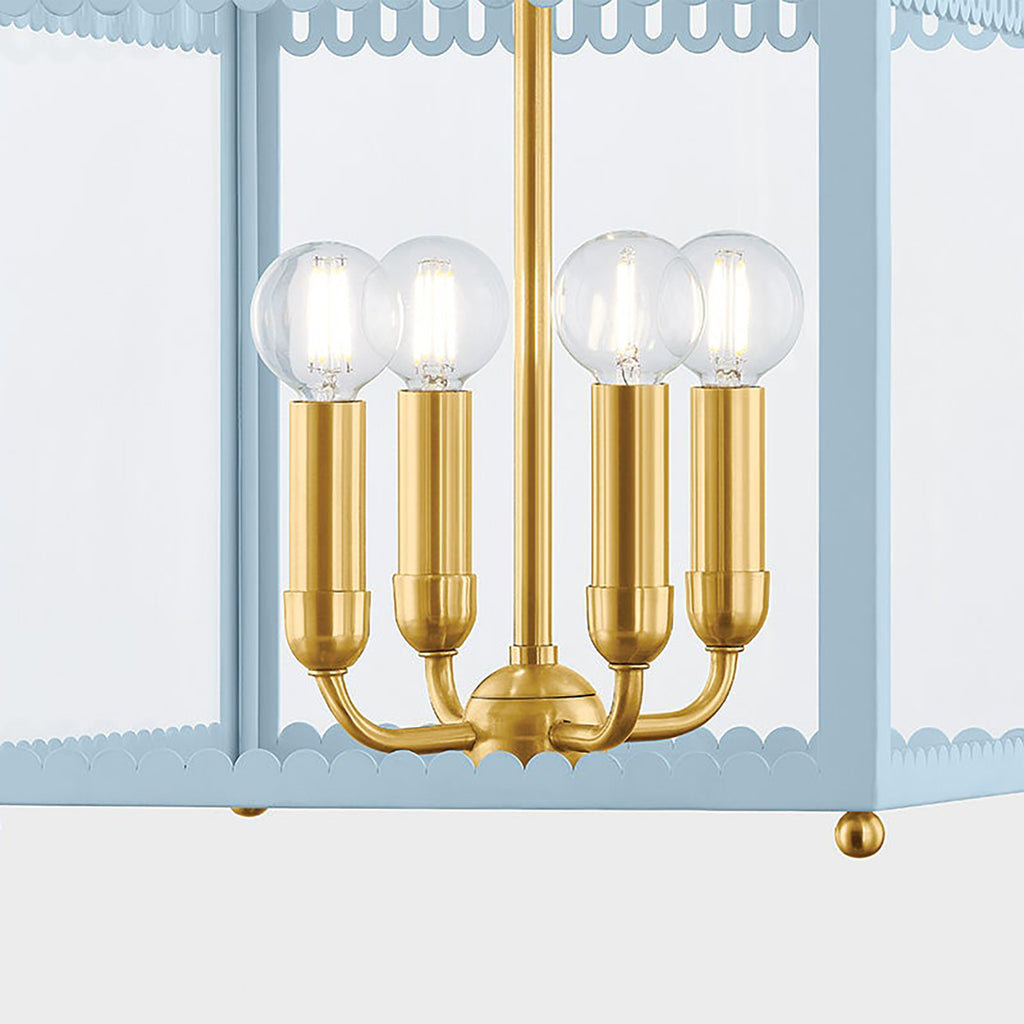 Embracing the grand millennial trend, Mitzi Rosalie presents a fresh take on a traditional box lantern. Scalloped and slatted details elevate the clean lines of this 4-light fixture. Additional decorative elements, like the Aged Brass sphere and delicate chainwork, add to the playful composition. Mitzi Rosalie is available in two sizes and two colors, Soft Cream or Soft Arctic Blue.