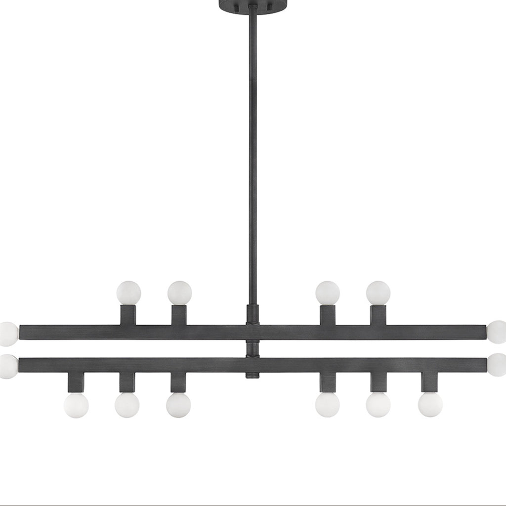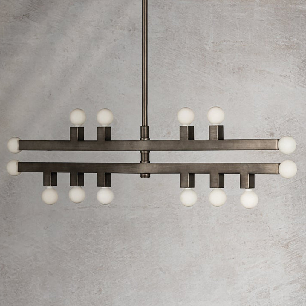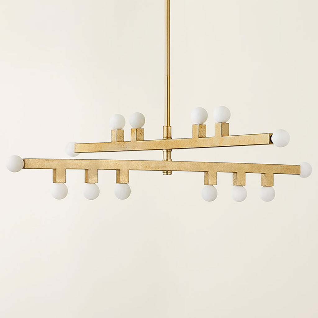 Merging modern simplicity with decorative flair, Mitzi Sutter Chandelier plays with parallels. Glass orbs are arranged with thoughtful asymmetries to create balance along a slender frame. Like a Mondrian painting, lines merge and intersect & except when they don't. Available as a sconce or chandelier in either a warm Vintage Gold Leaf or industrial Graphite finish.