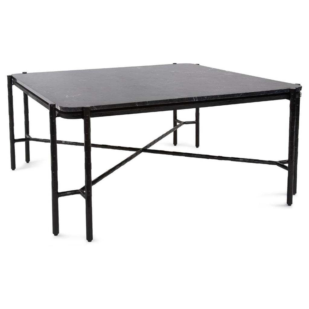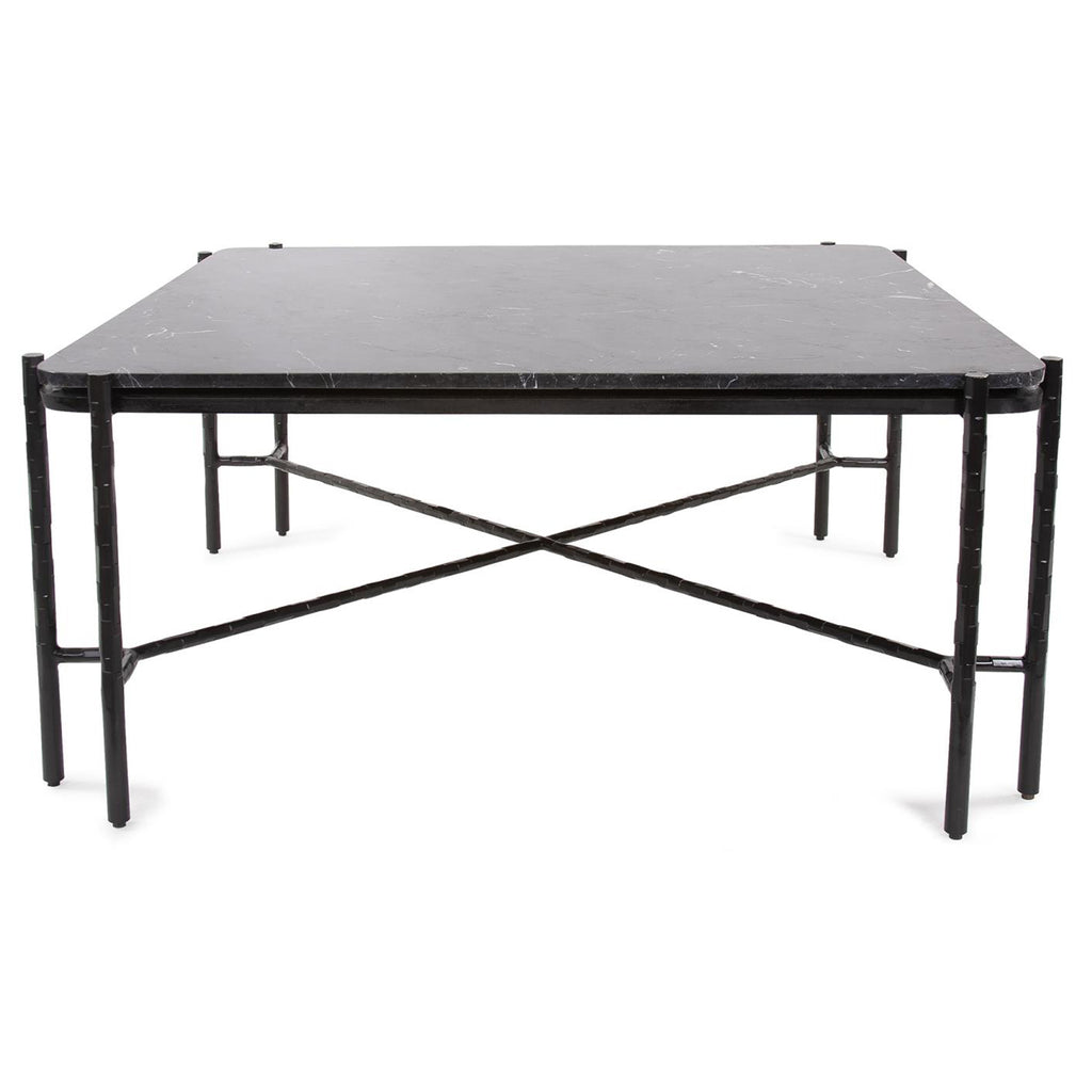 The modern architectural designs of Robert Myatt was the inspiration behind this collection of tables. Each table fame in matte black features a contemporary sculpted textural multiple legged design with criss crossed supports. To highlight the design of these tables we selected a beautiful black marble for the tops, that was hand carved and polished for each. The Myatt console table truly has a quality that makes it unique, alone or used in the complete collection.