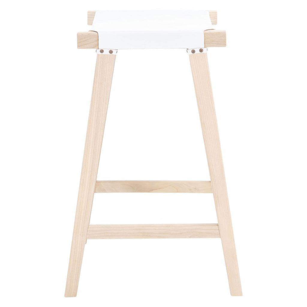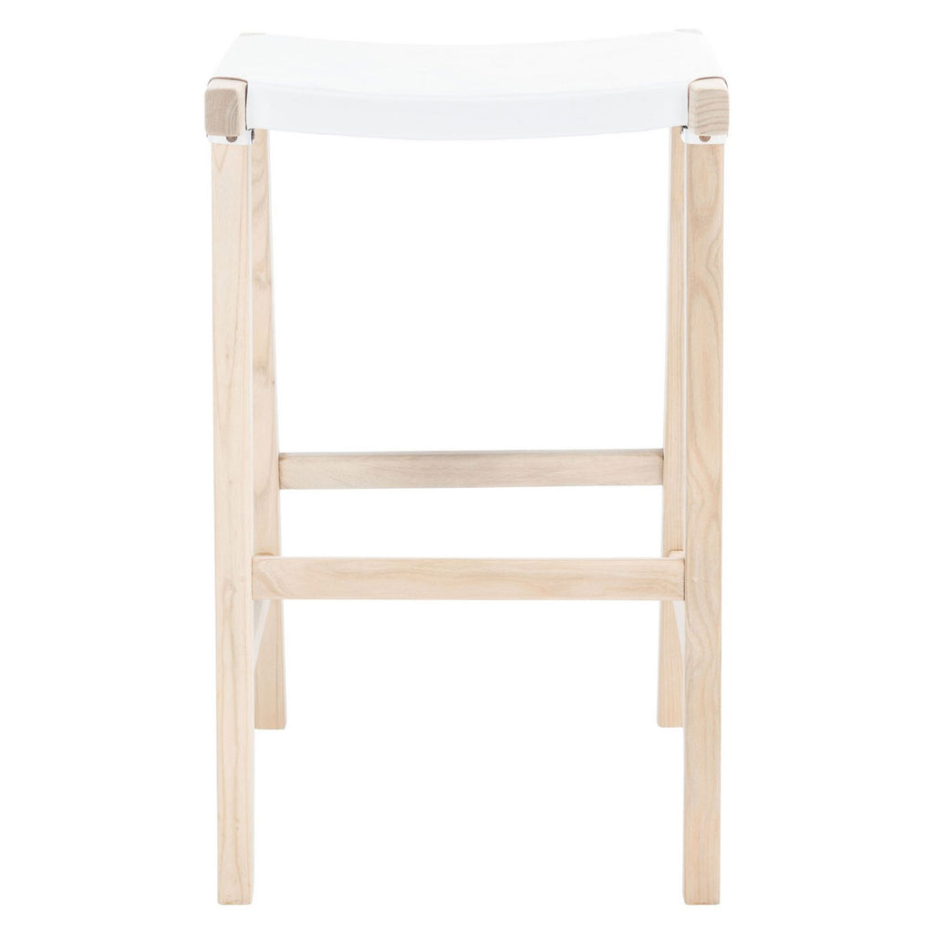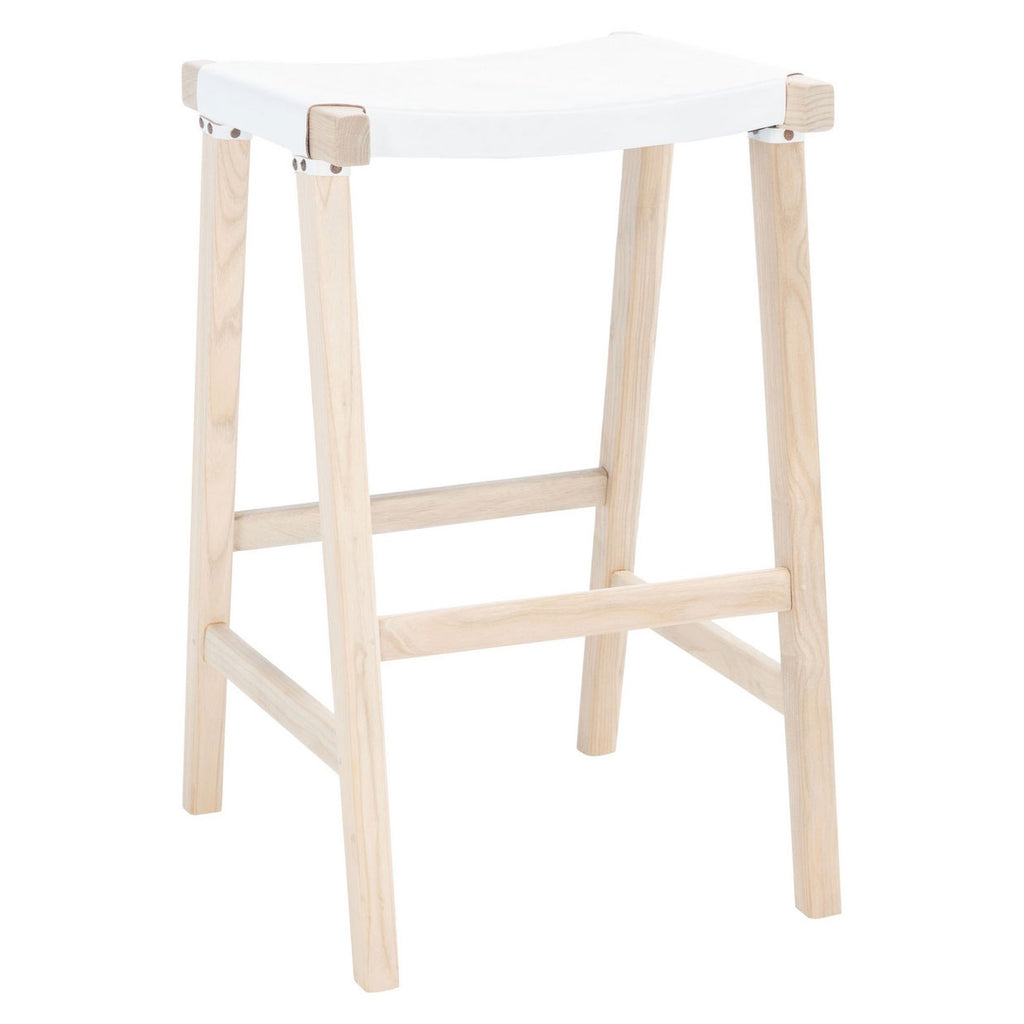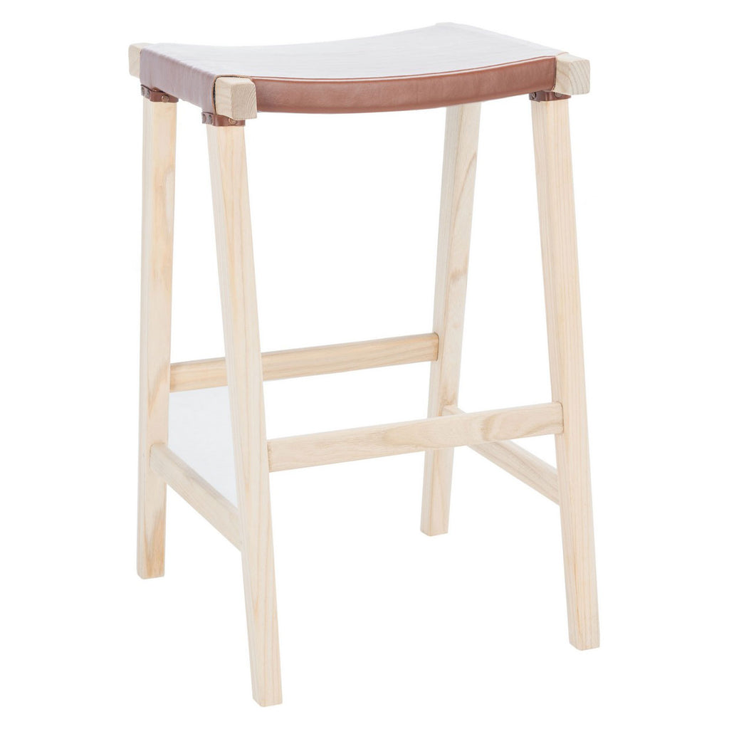 This bar stool is a beautiful blend of designer aesthetics, making for high style seating at the breakfast nook or indoor bar. The polished sawhorse inspired wood frame provides a chic juxtaposition to the leather seat, bringing unique visual intrigue to any décor.