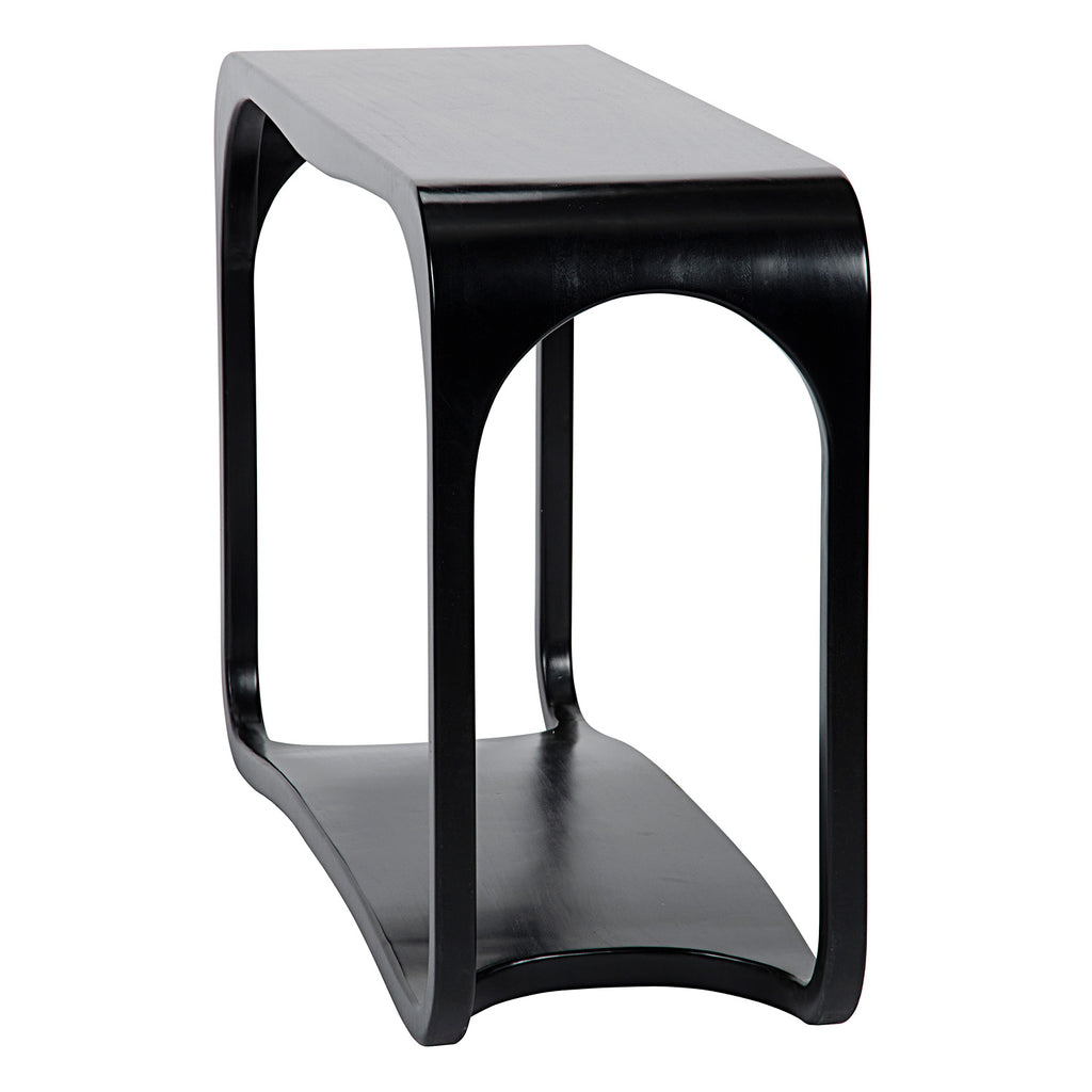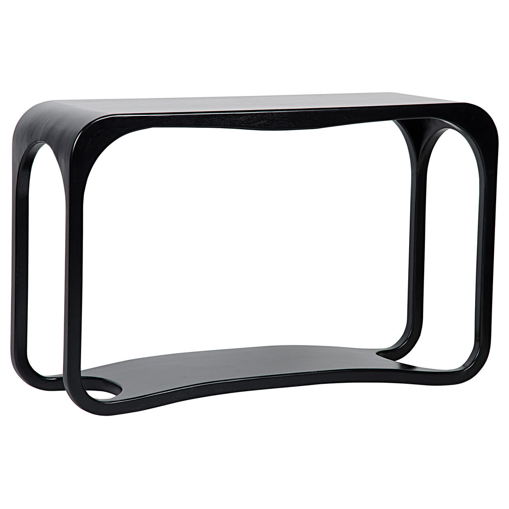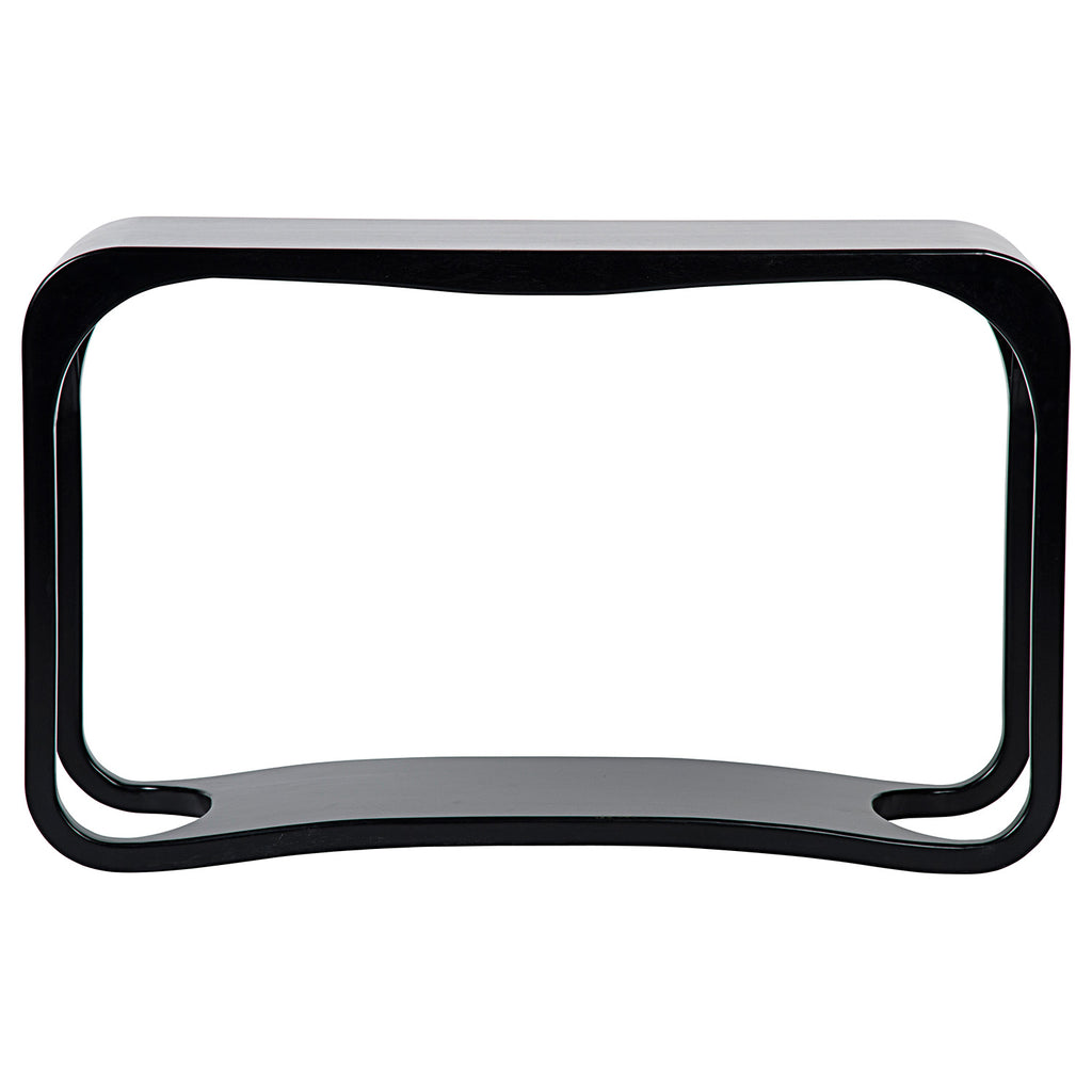 An excellent addition to a foyer or hallway, this Noir console table delights with contemporary flair. Simple yet chic, this functional furnishing adds dimensional depth to any space. The Noir Milena console table features a rounded rectangle of mahogany, simplicity defined, is enhanced with subtle curves and a hand-rubbed black finish in this upscale minimalist design.