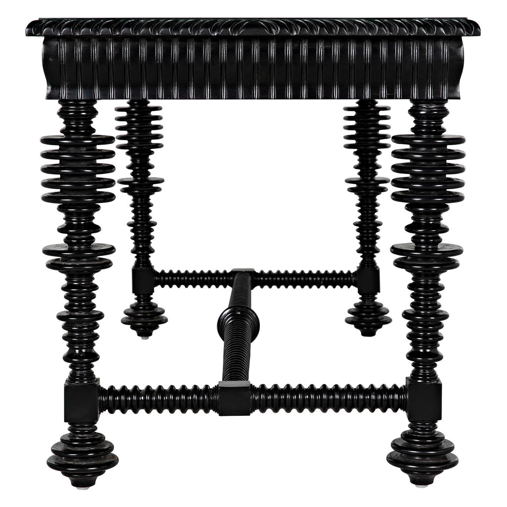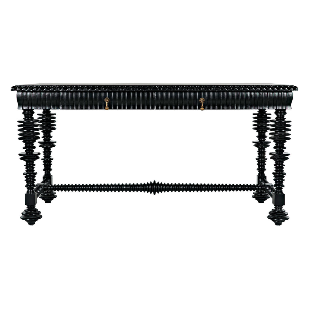The Noir Portuguese desk is a sublime example of spool turning. Its magnificent legs and stretcher, ornately carved apron, and mahogany construction elevate an otherwise simple design. A rich hand rubbed black or brown, hand-applied white wash or distressed grey finish and pulls complete the look. Three drawers keep you organized!