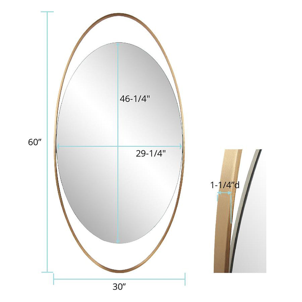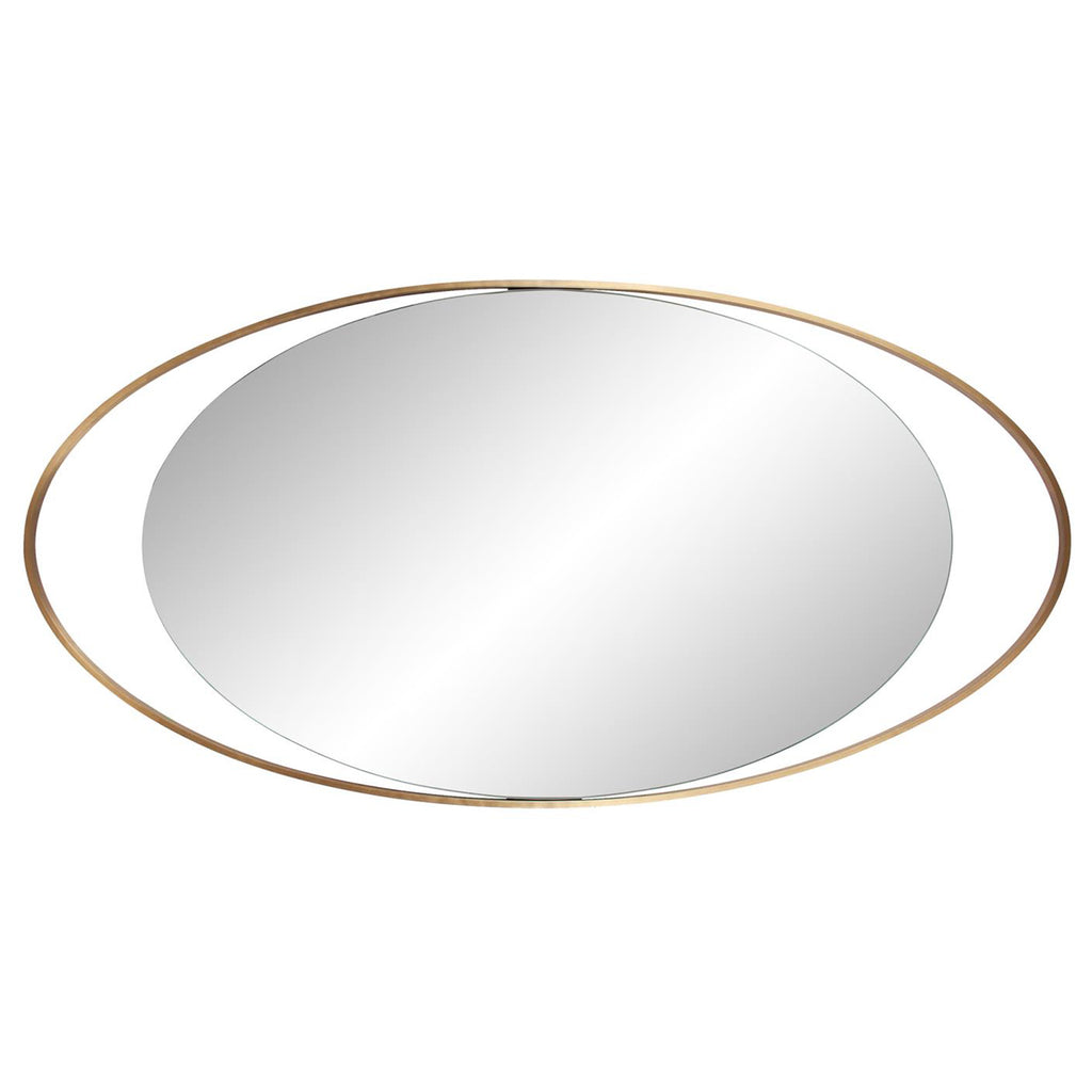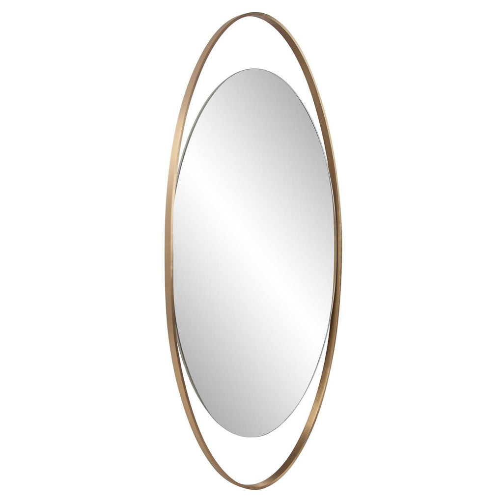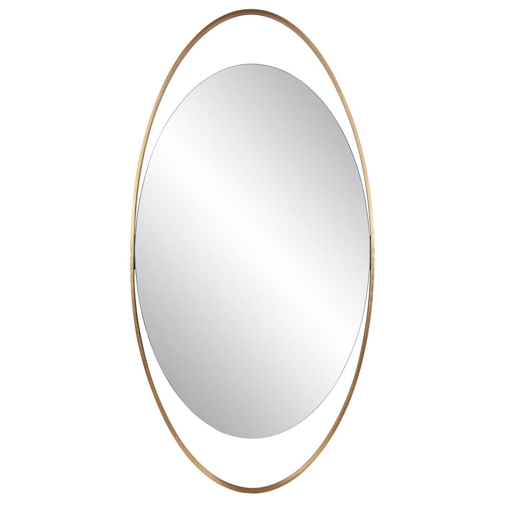 A beautifully designed Nouvel elliptical stainless steel frame is perfectly balanced with a frameless inner mirror that repeats the shape and form of the design. The outer frame finished in brushed brass seems to be effortlessly holding up the center floating frameless mirror. The modern minimal design allows this piece to take a prominent place in any room in the home from dressing room to foyer.