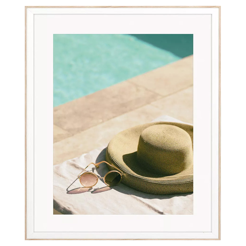 Summertime vibes invite you to chill and relax. Matted in white and framed in a ribbed white wood with blonde wood finish side.