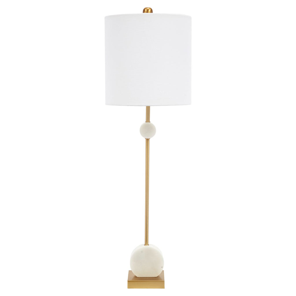 The focus of Old World Design is to fill the void in the lighting and home accessory market with high design and high-quality products. Each exclusive finish is hand applied to produce a high-end look with exceptional value. Wren white marble disc buffet lamp with brass inlay and white shade.