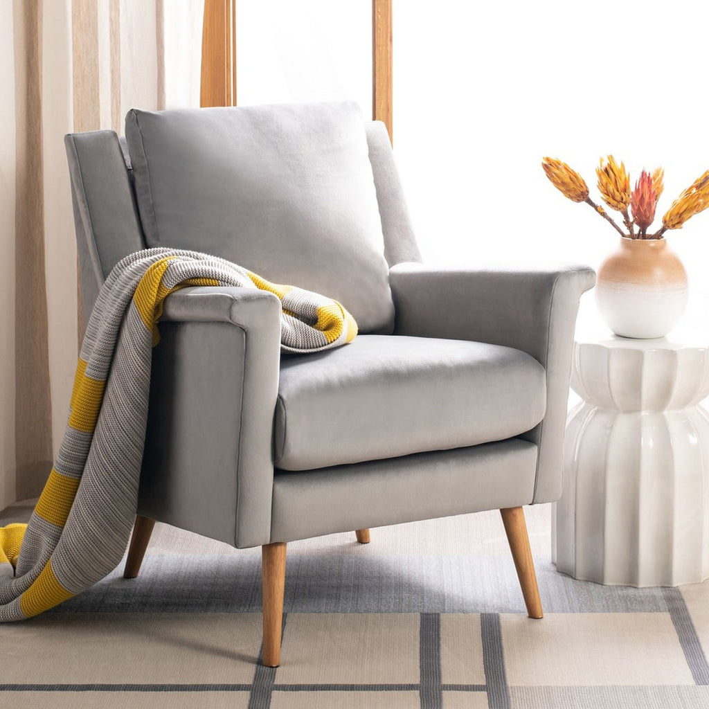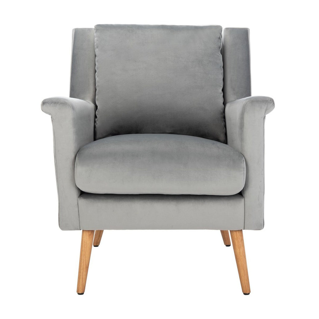 Fashion-forward and endlessly chic, the mod style of this mid-century armchair elevates any living room. Welcoming and cozy, its luxurious velvet upholstery pops with its vibrant stone hue. The natural beauty of its solid oak retro legs makes it a classic.