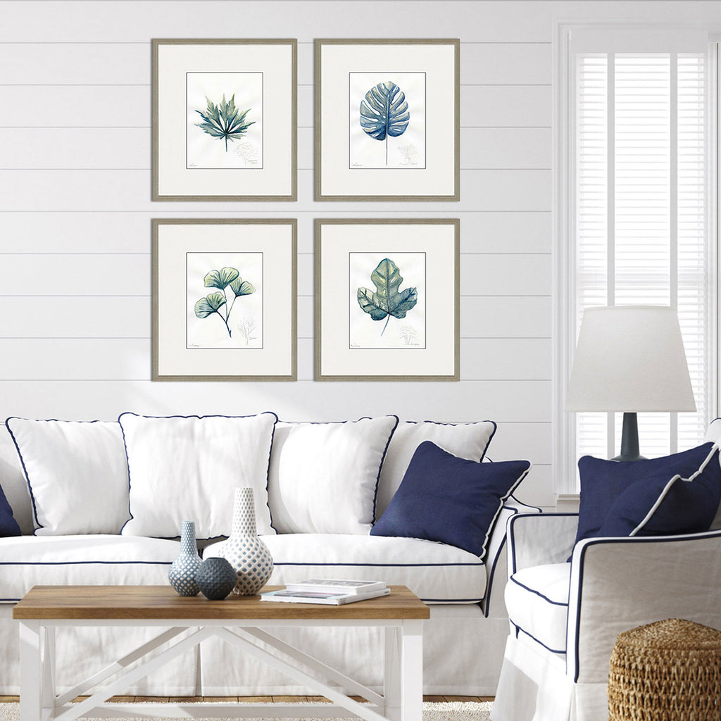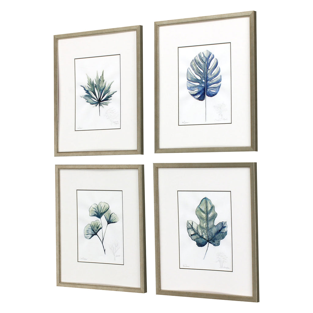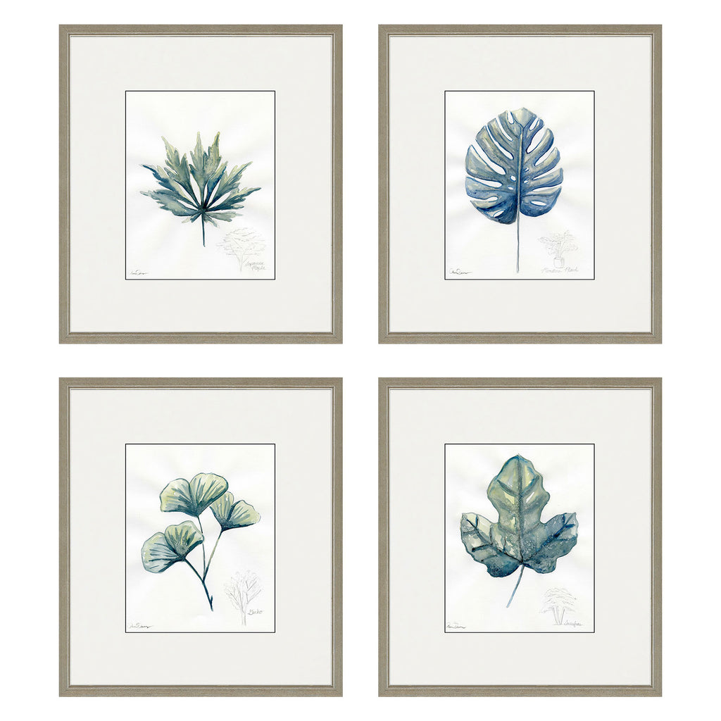 A variety of leaf drawings are matted in white. Framed in a sleek champagne gold wood. Sold as set of four.