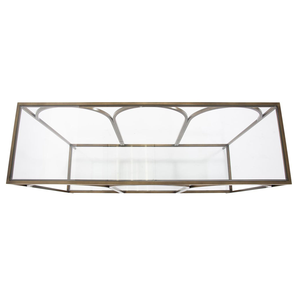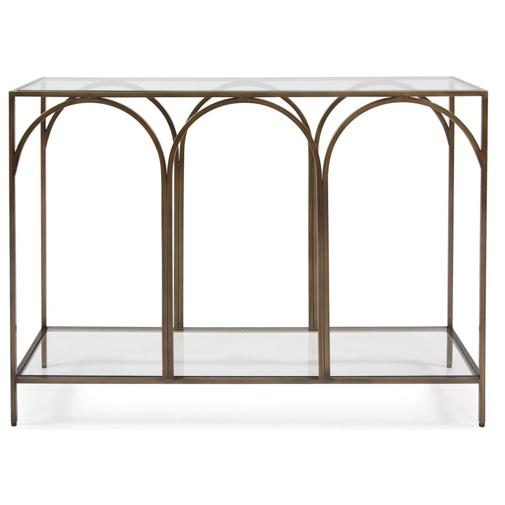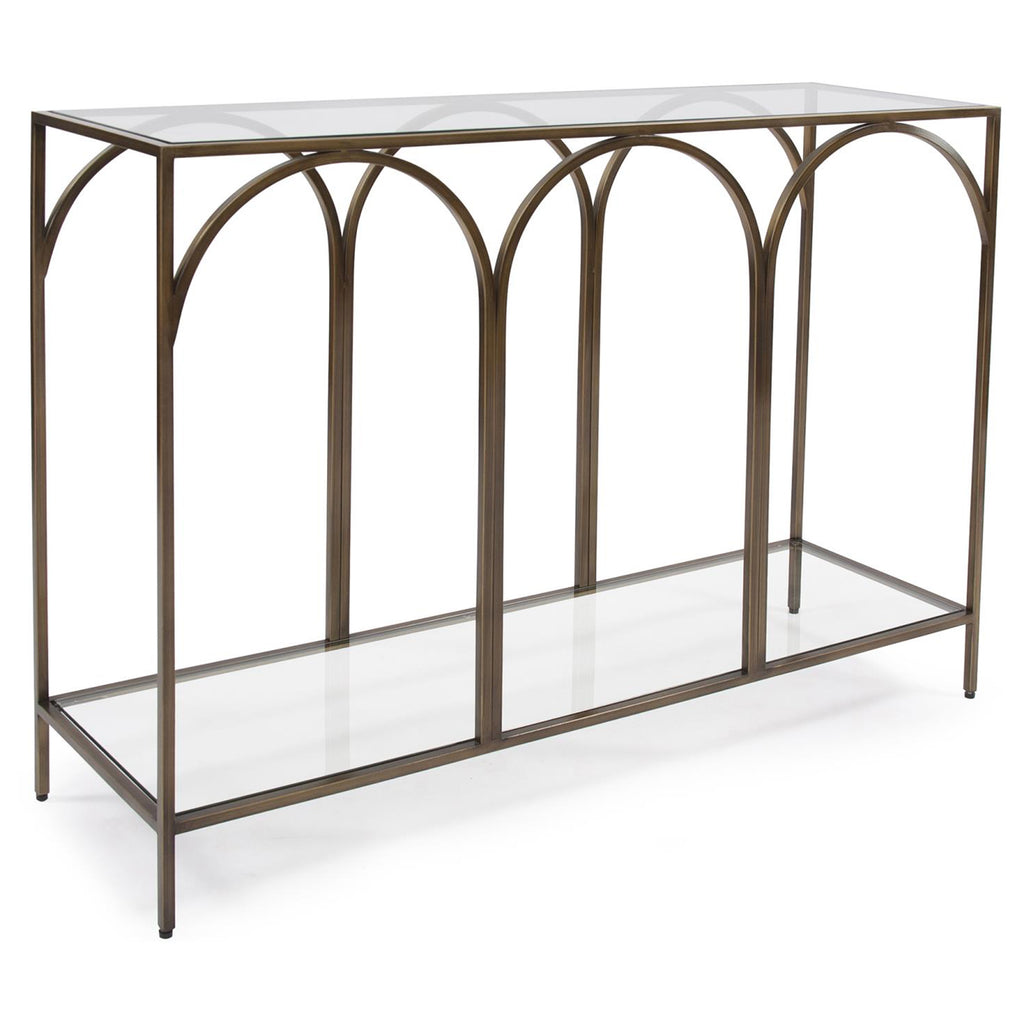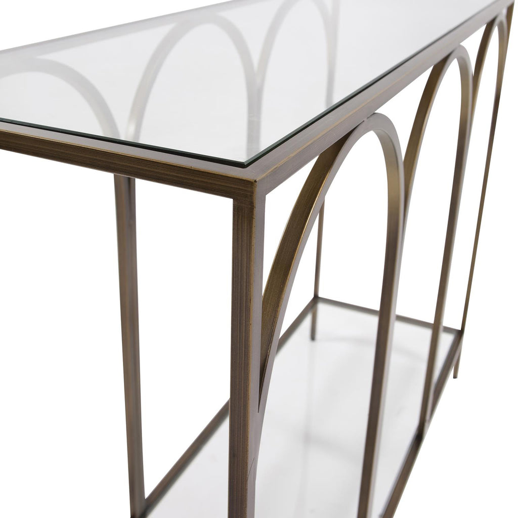 The arched windows of the early 18th century inspired the Palladio Console Table. The hand rubbed bronze finish not only highlights the curved edges but also adds to the richness and feel of the overall style. Clear tempered glass shelves. Pair with the other pieces in the collection to complete the look.