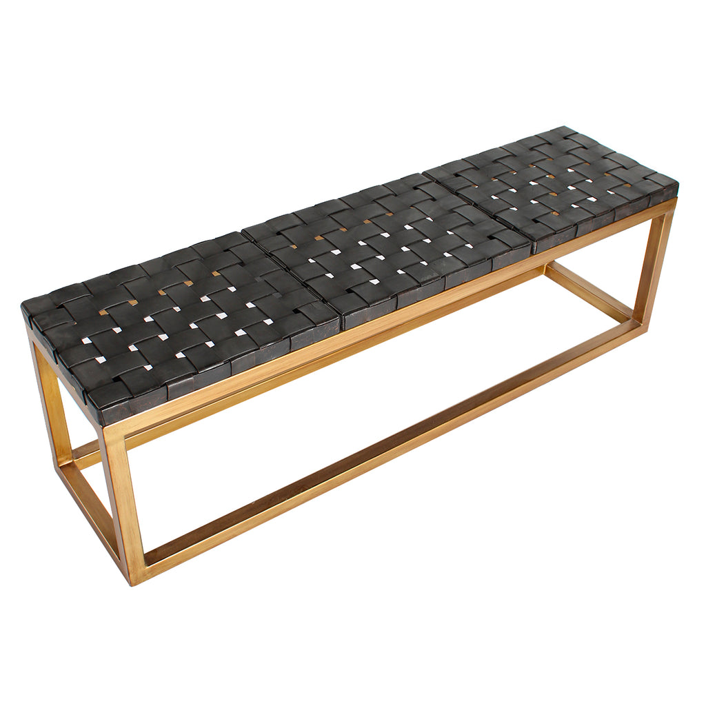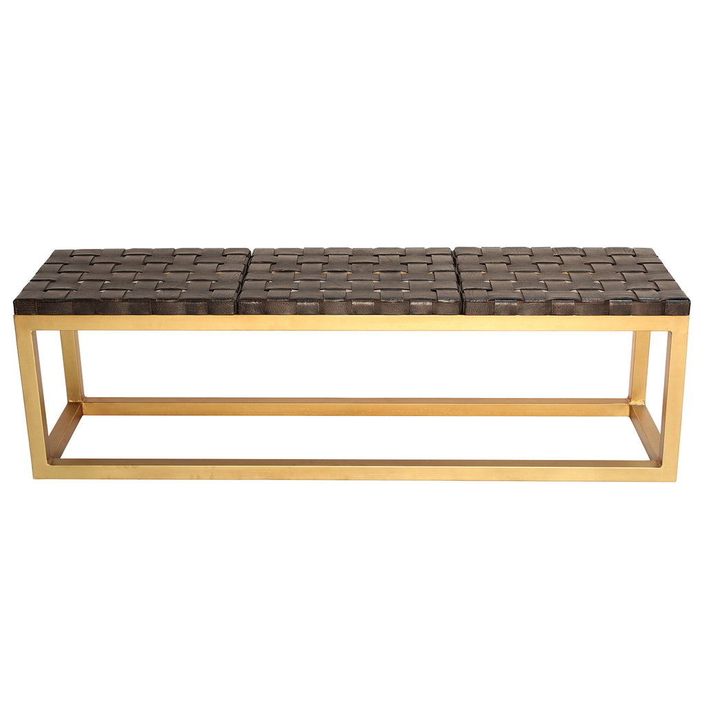 The Peninsula Home Austin bench has a matte gold finish on its metal base and its finished with a hand woven vegetal tanned un-split leather. Strong, transitional, and stylish, this bench is built for durability to be enjoyed for many years.