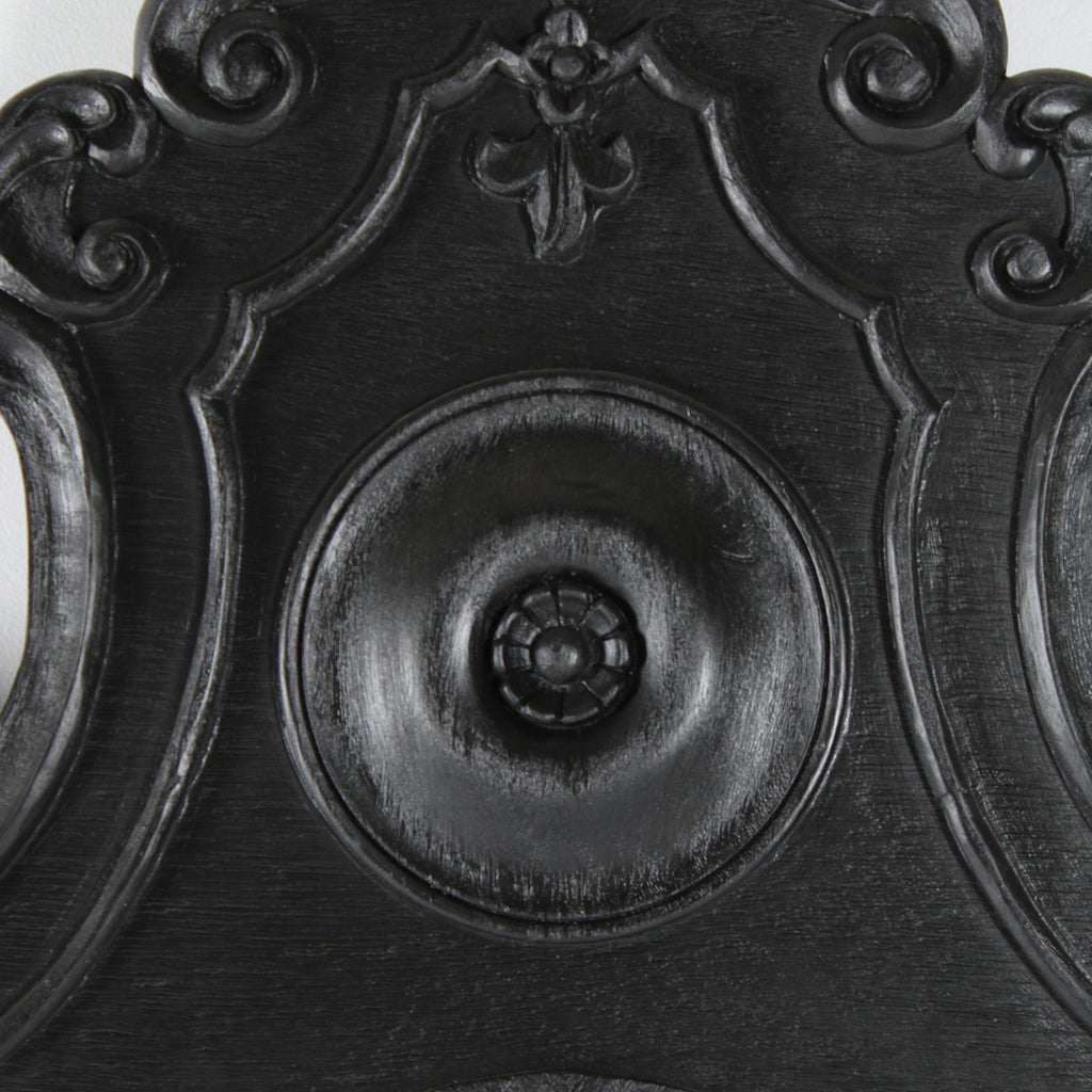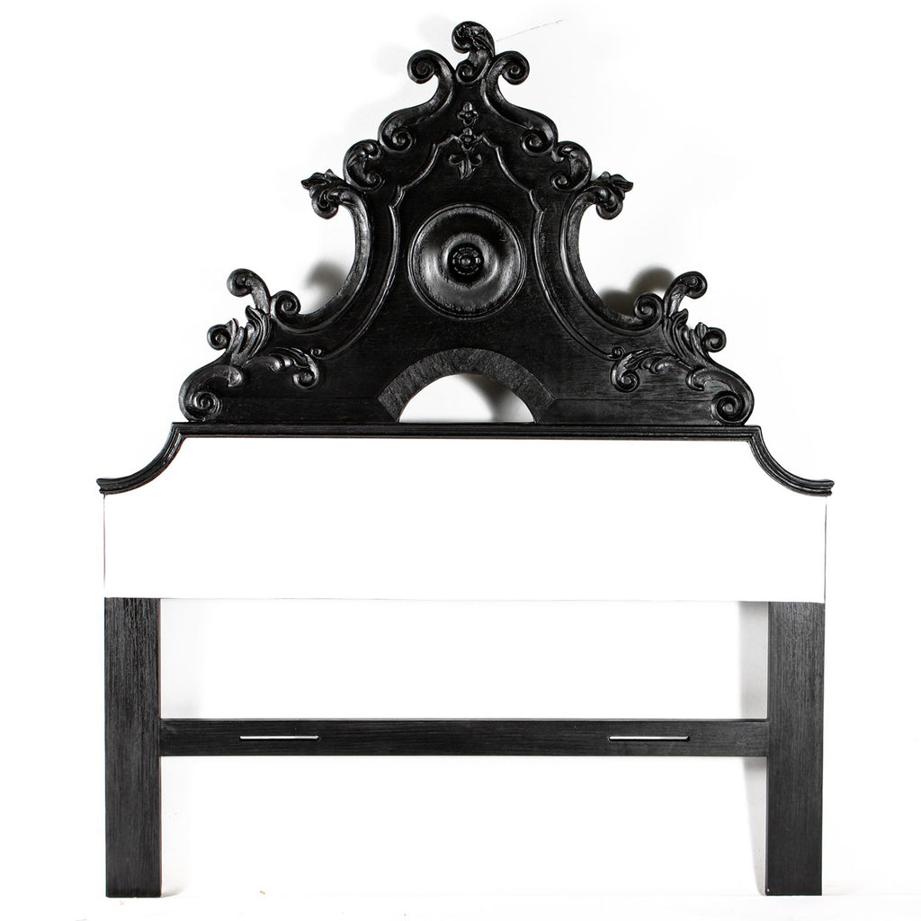 Architecturally inspired this headboard has all the elements of antique European pieces. a dynamic shape that has a center medallion carved into the headboard is completed with a white fabric pad that softens the lower part of the headboard for comfort.