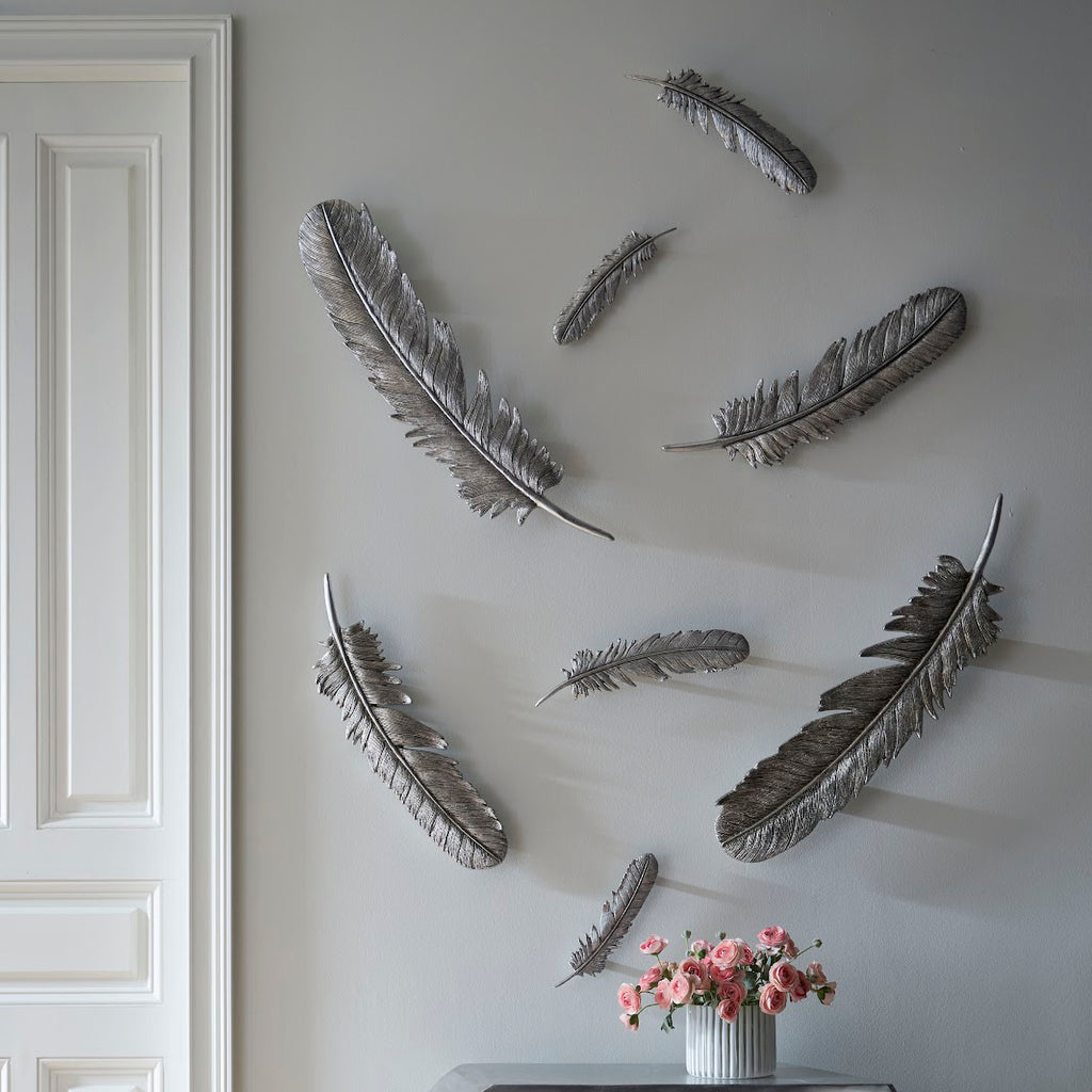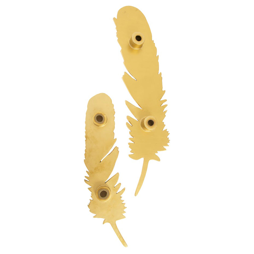 With the asymmetrical shapes that emulate real bird feathers that have been thoroughly preened, The Feathers Wall Art Set is made of composite in a luminous gold leaf finish. Arching toward each other, the decorative wall sculptures also vary slightly in size to create a textural installation that will bring beauty to any room.