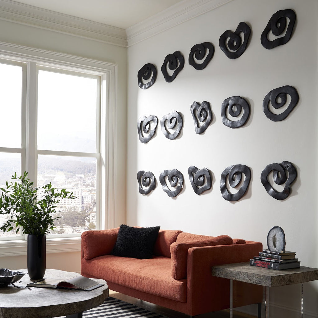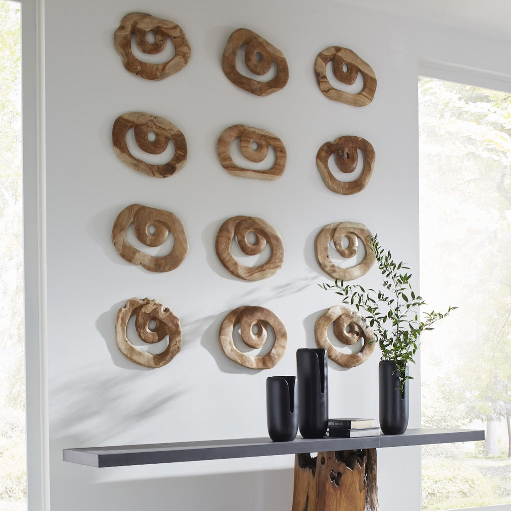 Childlike in its rendering, the Swirl Wall Tile will bring a hint of whimsy to a room. This round teak wall tile is lively when hung singly but group them in an arrangement and watch them gain even greater felicity. The warmth of the teak and the powerful woodgrain on the surface of the circlet would normally make this wood sculpture traditional in style but the clean lines of the rings bring it a modern organic vibe.