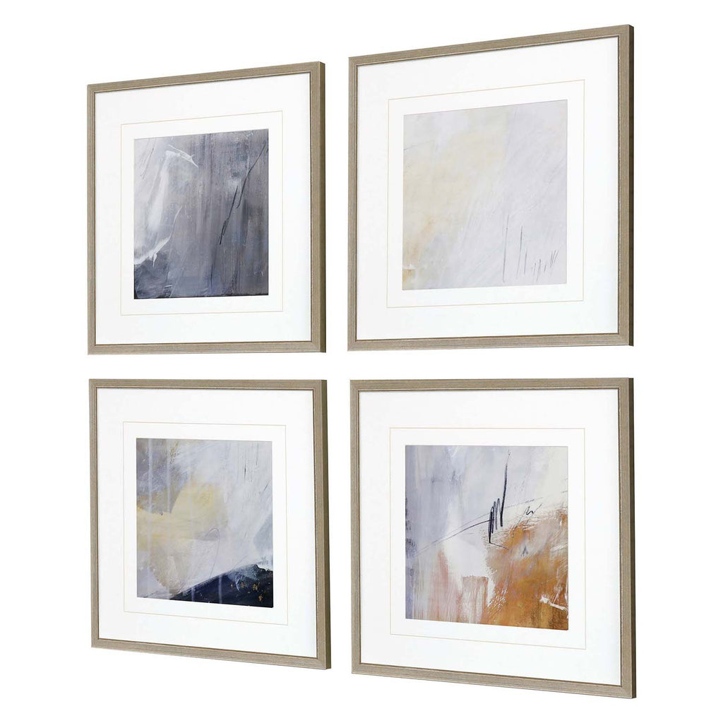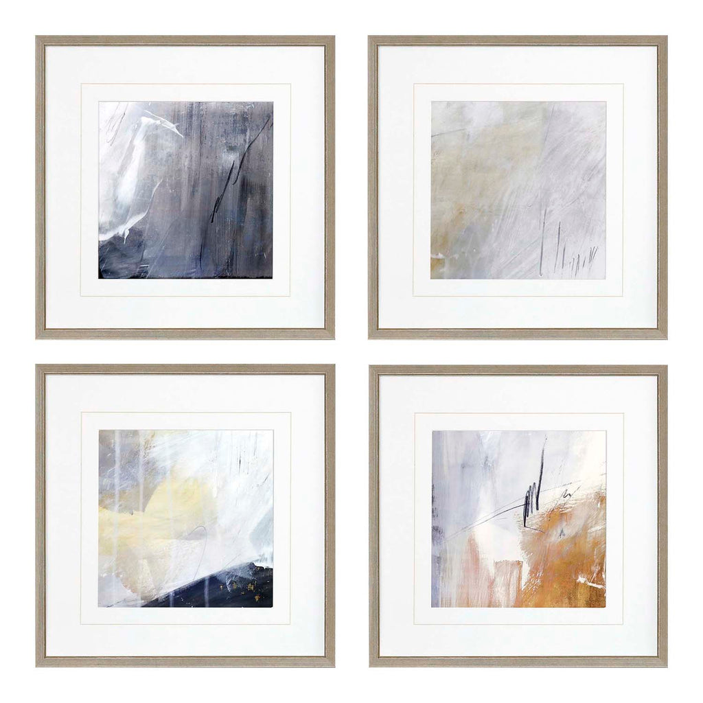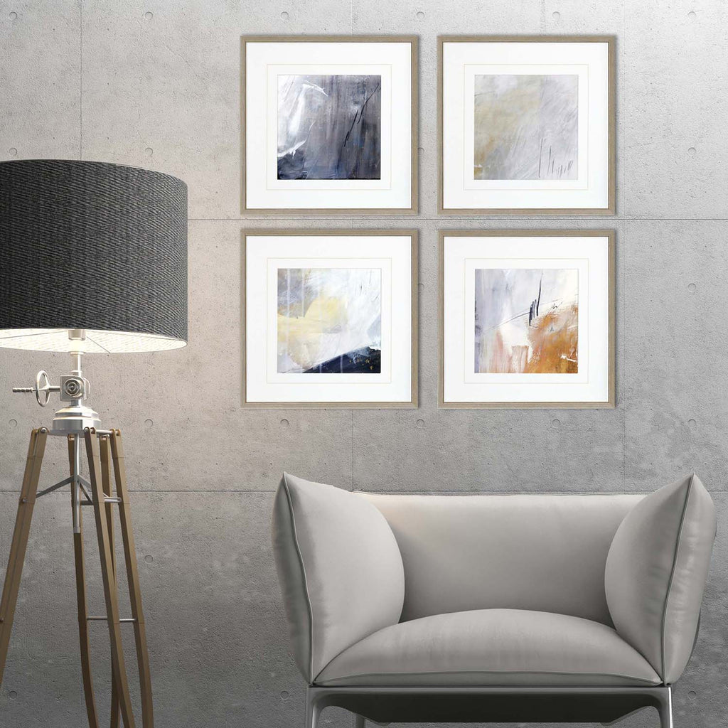 Modern abstracts in shades of blue are matted in white. Framed in a sleek champagne gold wood. Sold as set of four.
