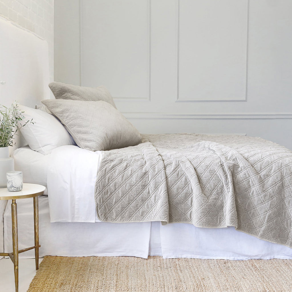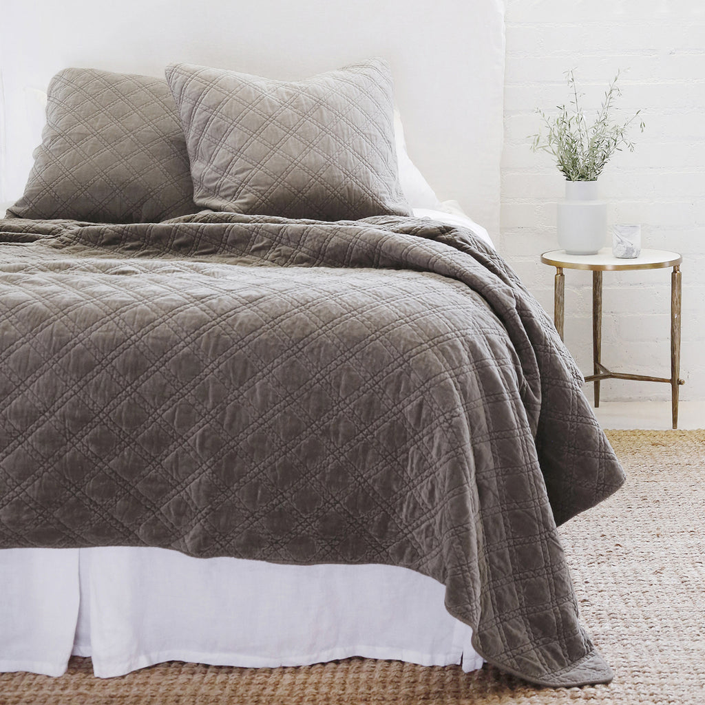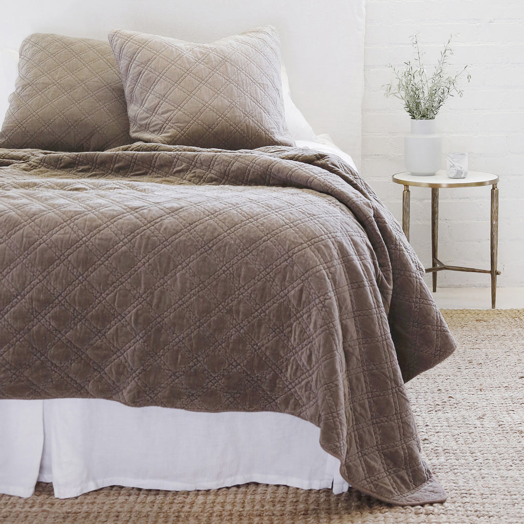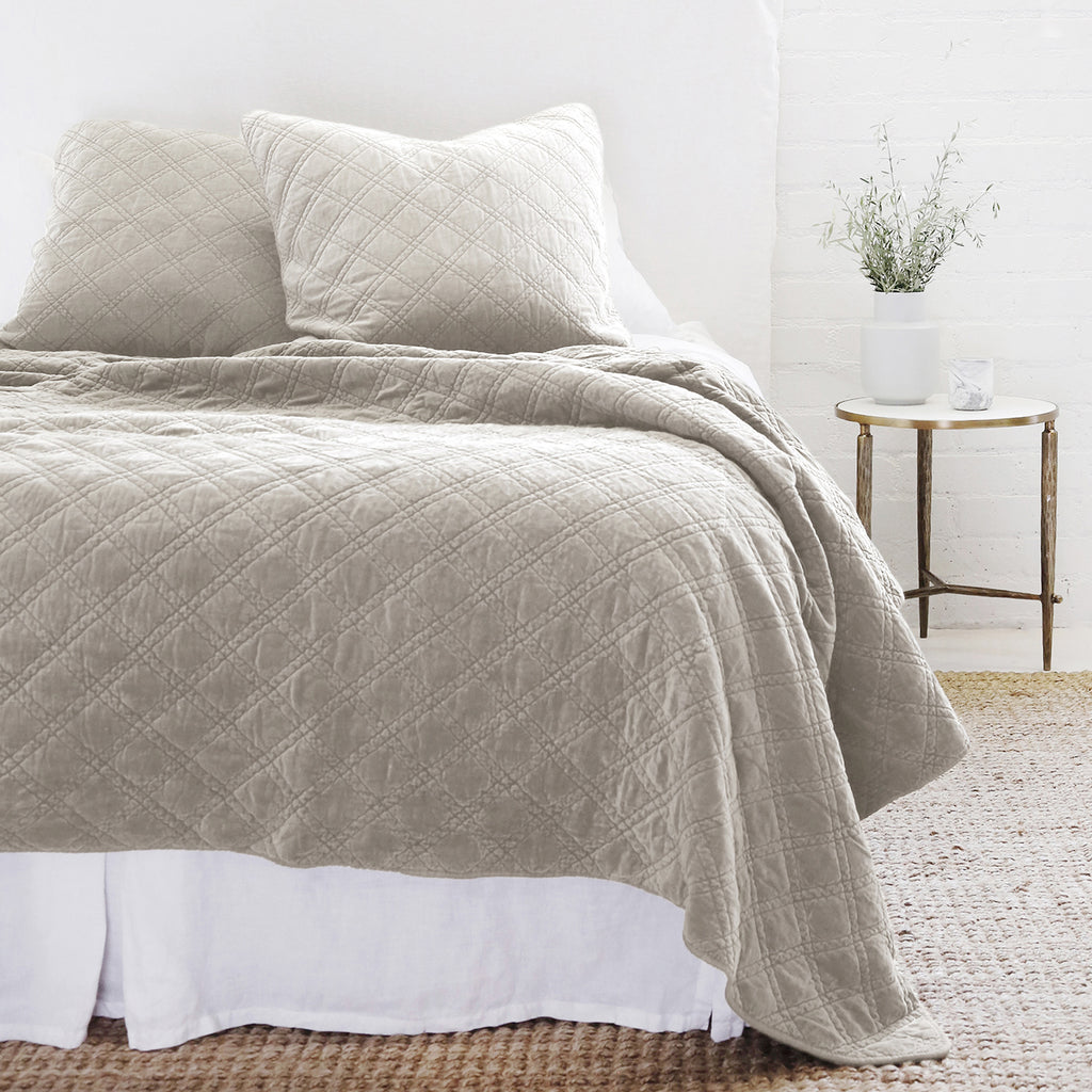 A grand and sophisticated line that has a diamond quilted pattern on the front, made of 100% stone washed cotton velvet. Available in several soft, stone washed colors.