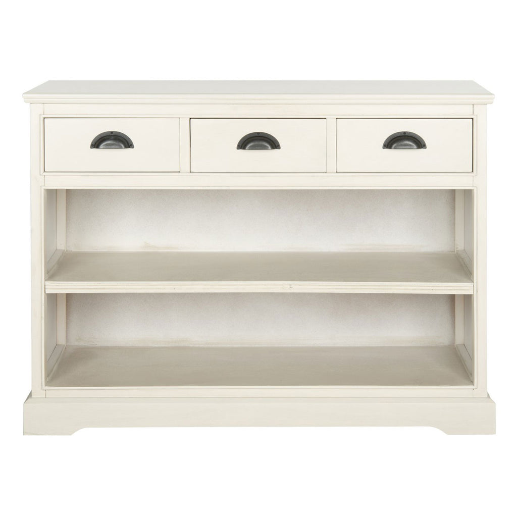 Form meets function in this vintage-look bookshelf unit in pine with a pretty grey or white painted finish. Adapted from a Louise Philippe flea market find, this piece has three drawers with half-moon pulls and two shelves for books and curios.