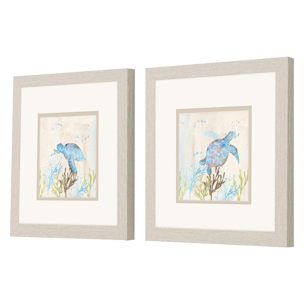 Bright blue turtles are matted in white. Framed in a distressed whitewash finish moulding.