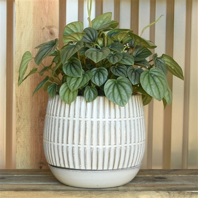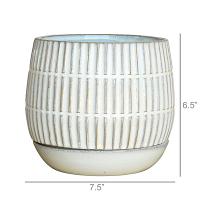 This stoneware cachepot with a hand sculpted pattern is glazed in white and sized to drop in a standard 6in growers pot. Indoor gardening made easy!