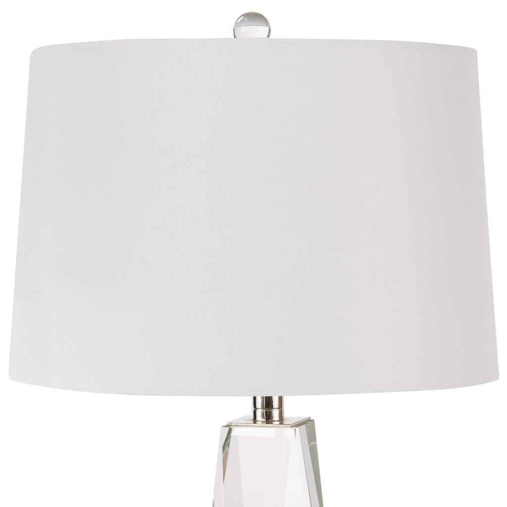 The Regina Andrew Angelica Table Lamp is crafted of solid hand polished crystal, fitted with polished nickel hardware and topped with a natural linen tapered shade. This clear and sculptural lamp lends itself to a variety of settings, making it a versatile option for the living room, bedroom, or sitting room.