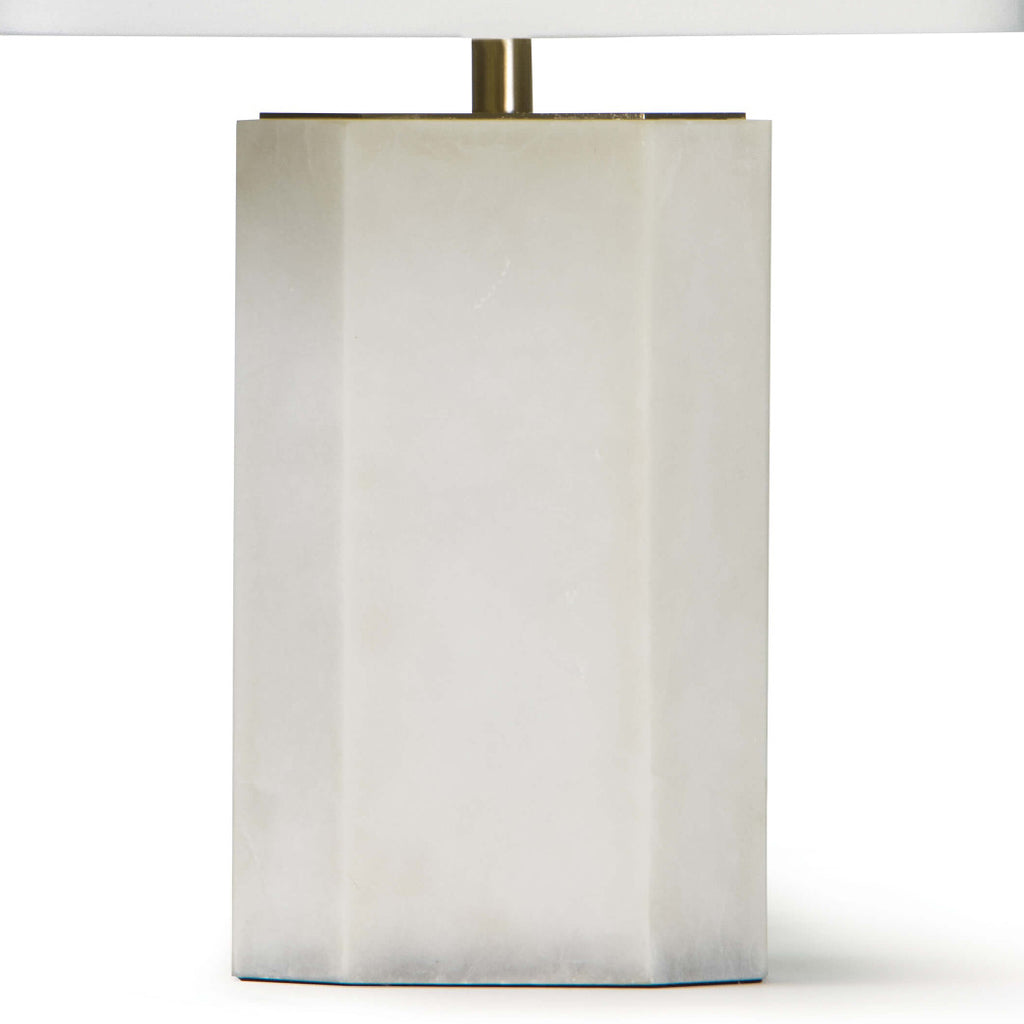 Clean lines and elemental materials lend an iconic quality to the Regina Andrew Grace alabaster table lamp. Featuring natural brass hardware, a crisp natural linen shade and held in place by a brass finial. The elegant geometrical profile makes a simple yet stunning statement when viewed from any angle.