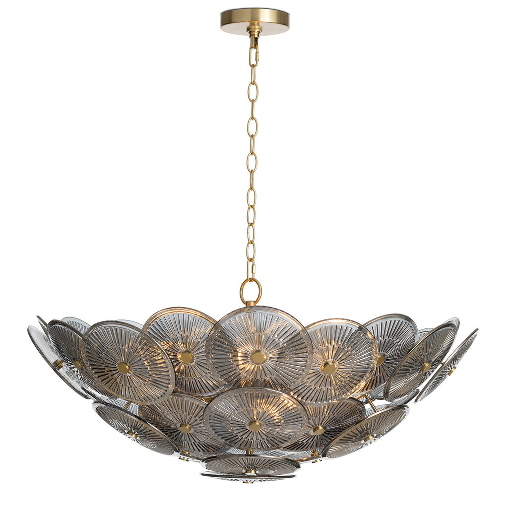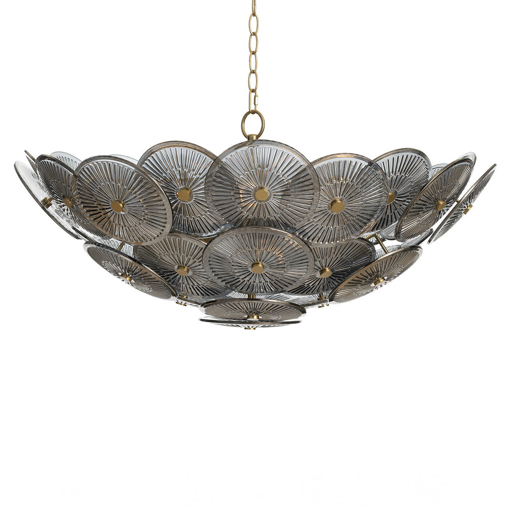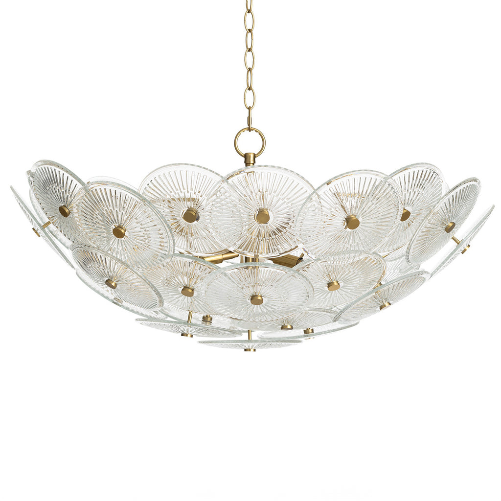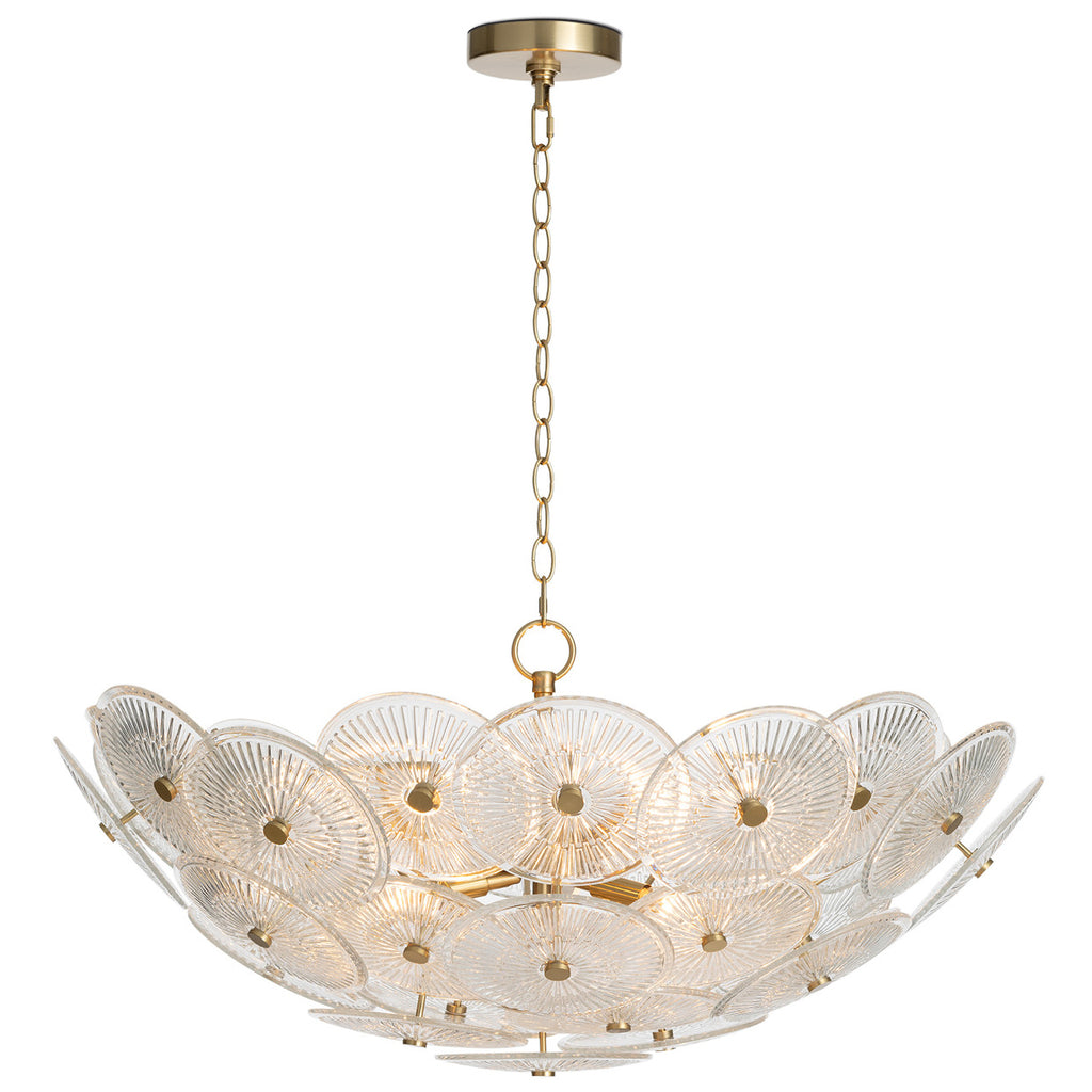 The Holly chandelier is captivating, featuring overlapping glass discs with intricate linear details reminiscent of vintage ceiling medallions while suspended on a natural brass chain. The medallions feature dotted natural brass finials for a modern, opulent touch.