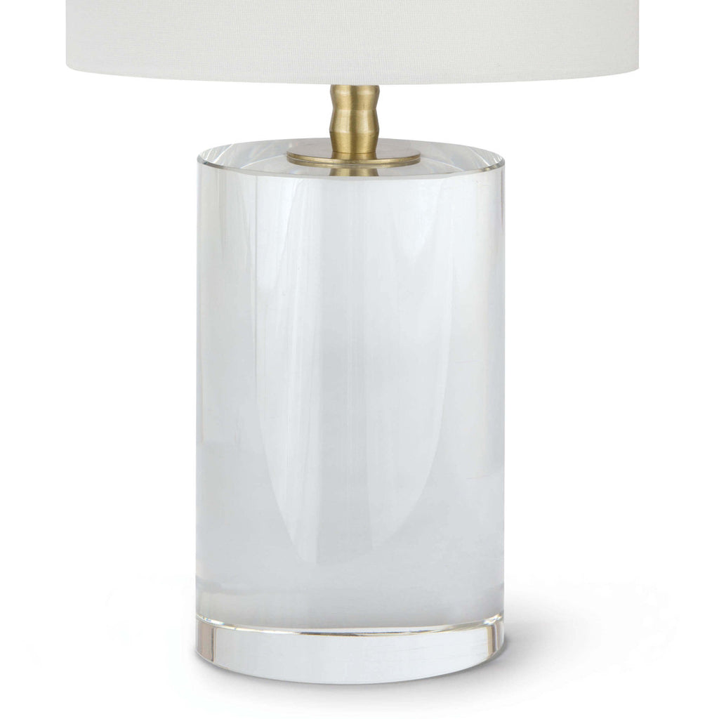 Stunning and elegant, the Regina Andrew Juliet Table Lamp is crafted of optical crystal, fitted with natural brass hardware and topped with a natural linen drum shade. This clear and sculptural lamp lends itself to a variety of settings, making it a versatile option for the living or bedroom, or in pairs atop side tables flanked on each side of a sofa.