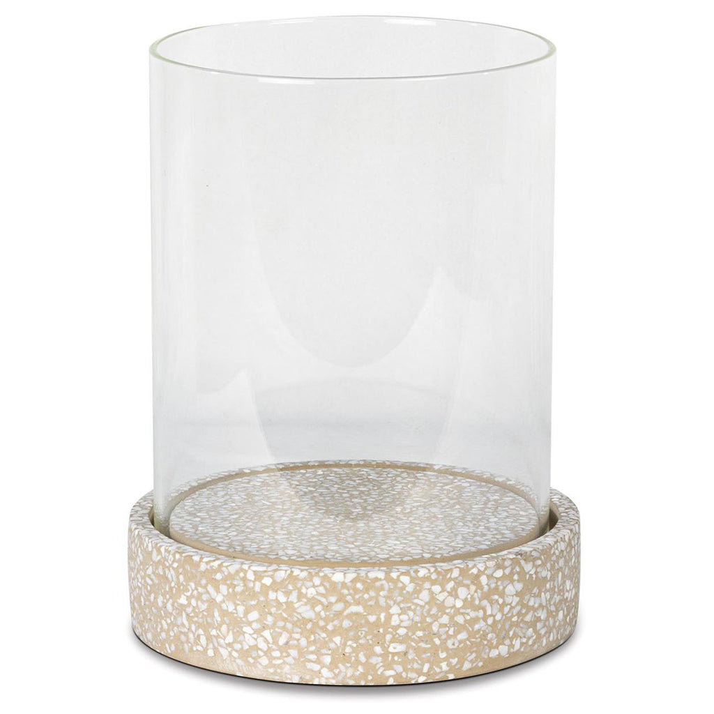 Crafted from gorgeous terrazzo and a tall glass tunnel, this boldly textured hurricane is a modern centerpiece that's every bit as good looking as your homes decor. Flecks of natural stones throughout provide you with a unique piece - no two are alike! Place it on your dining table for a candle light dinner, or as a neutral accent to brighten up your living room or bedroom.