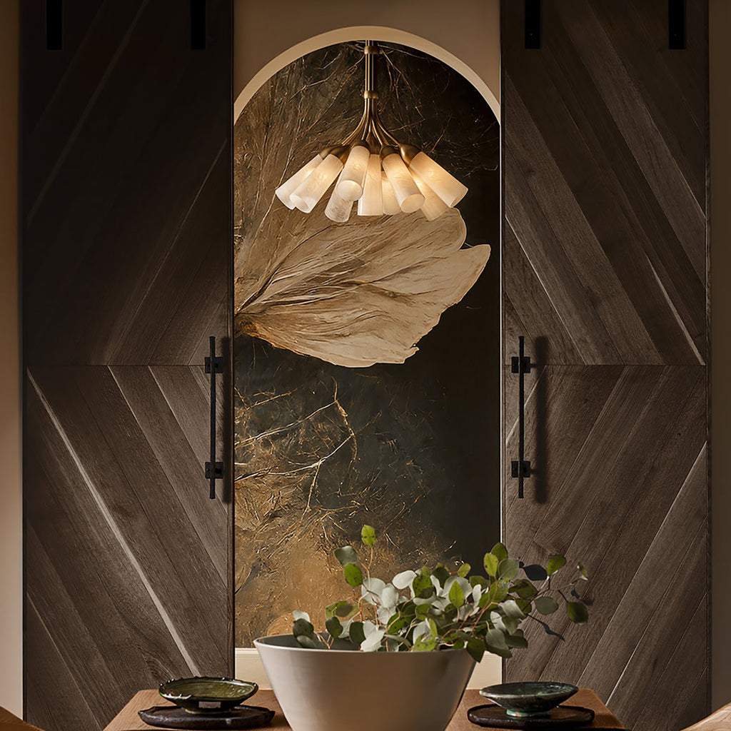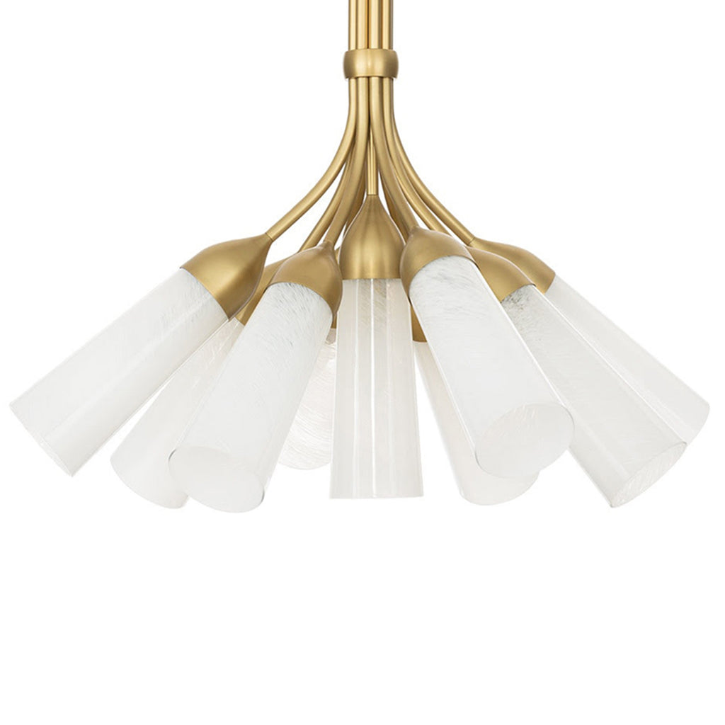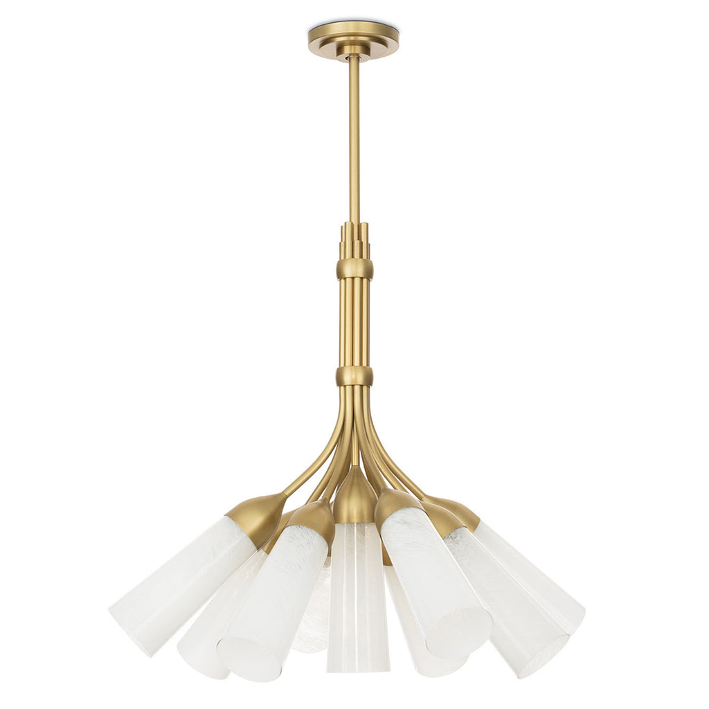 A beautiful blend of art and design inspired by the delicate form of a blossoming bouquet. Its fluted glass shades, cast a radiant glow, while the steel framework in a natural brass finish adds a contemporary touch. This chandelier is a sculptural statement piece, infusing sophistication, elegance, and artistic charm.