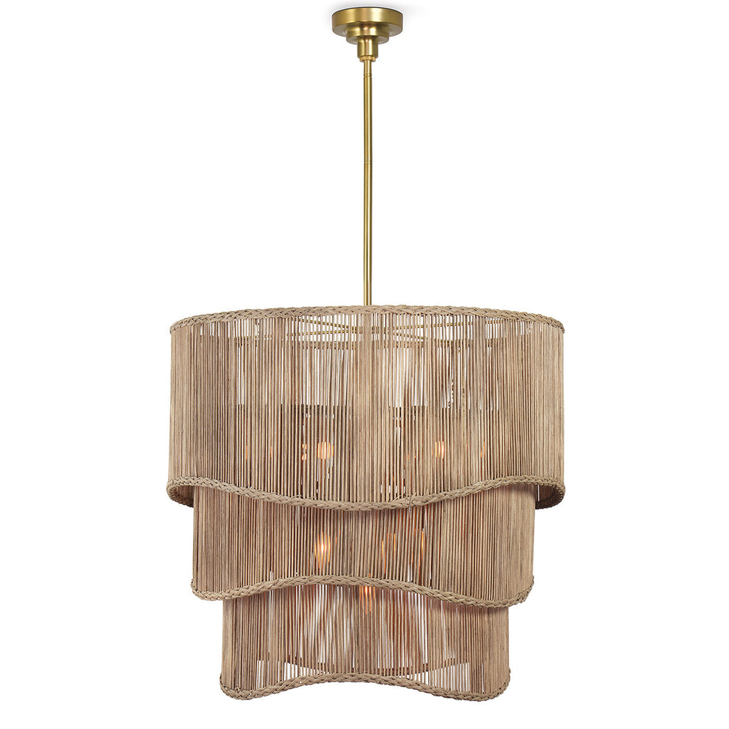 Three layers of woven drum shades with braided edges tier upwards, concealing a double bulb torch design in natural brass finish. The edges of the Nimes Chandelier shades ebb and flow, and the fixture's 11 bulbs evenly diffuse light with discreet elegance. This large fixture is a statement piece for any room in the house.