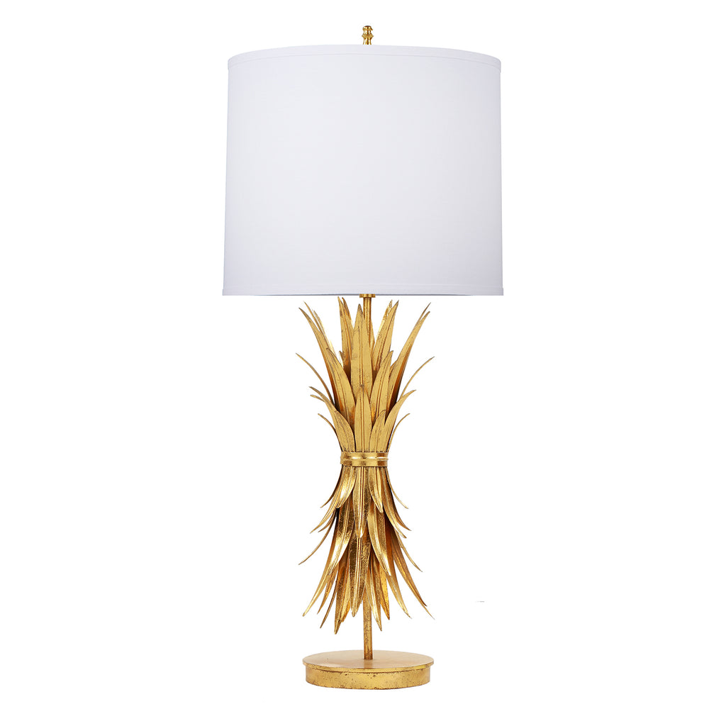 Ro Sham Beaux's Trigo Table Lamp is an Ornate Gold Leafed Lamp Base, Cast Brass Hardware and Finial. Heavy White Linen Shade with Gold Interior Included.
