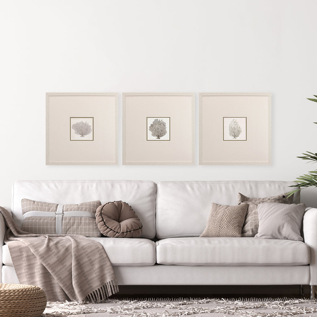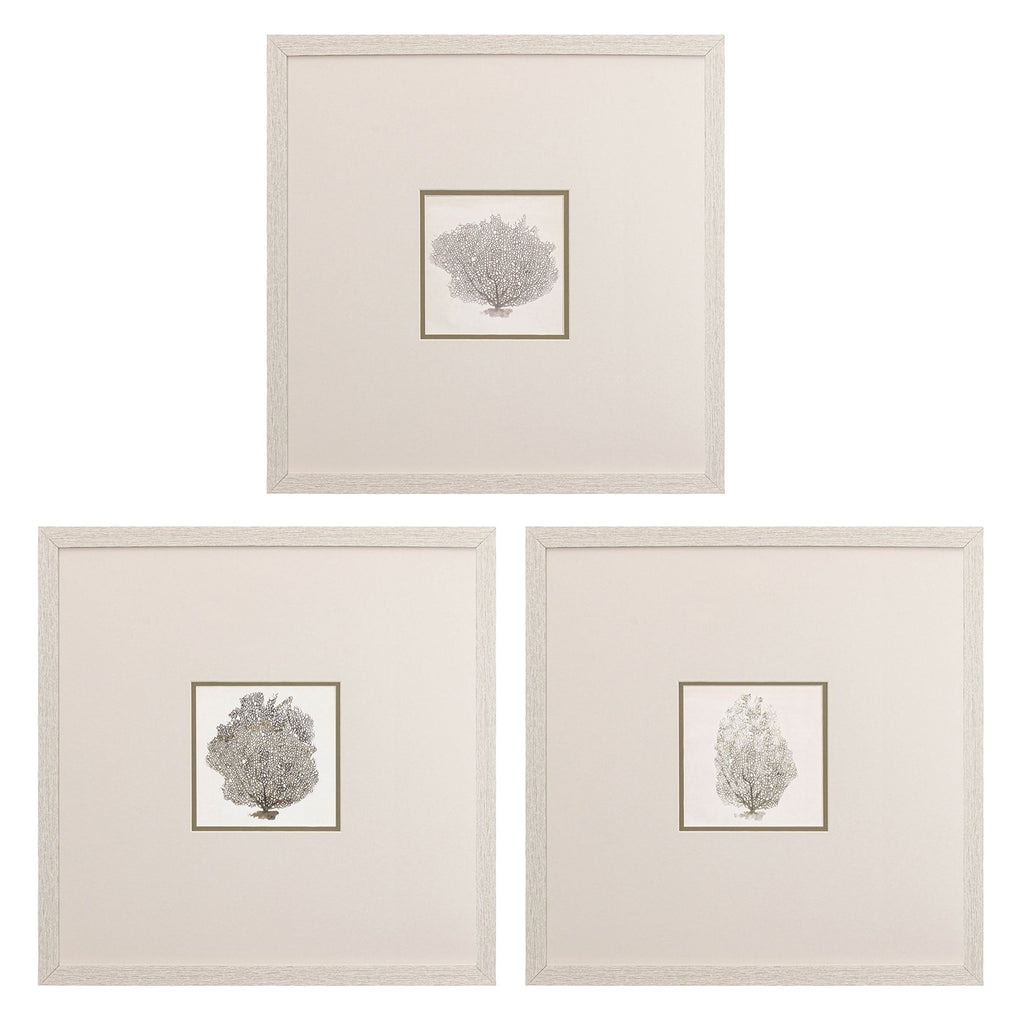 A set of three coral prints that are accentuated with heavy double matting. These pieces are framed under glass and paired with a white wash frame.