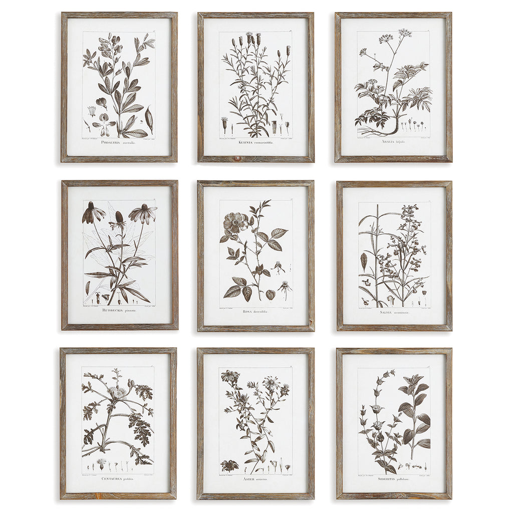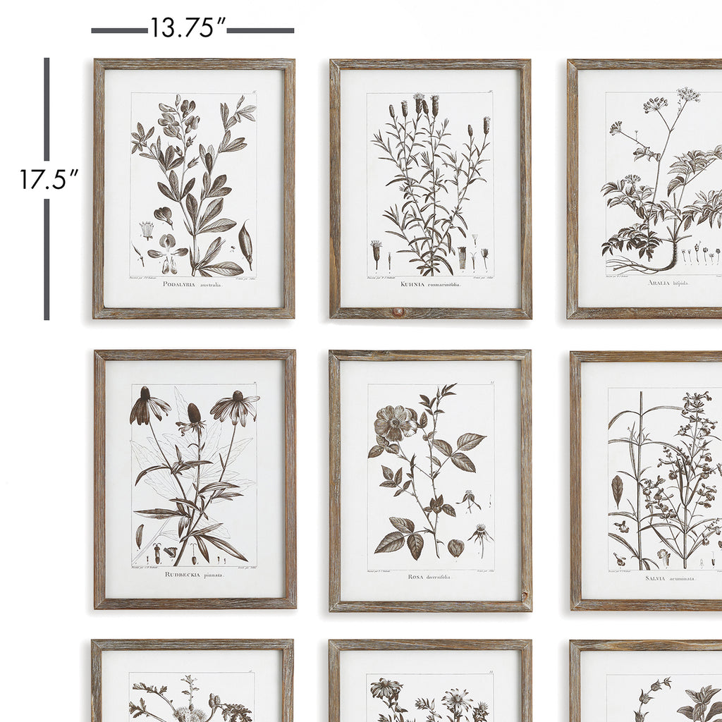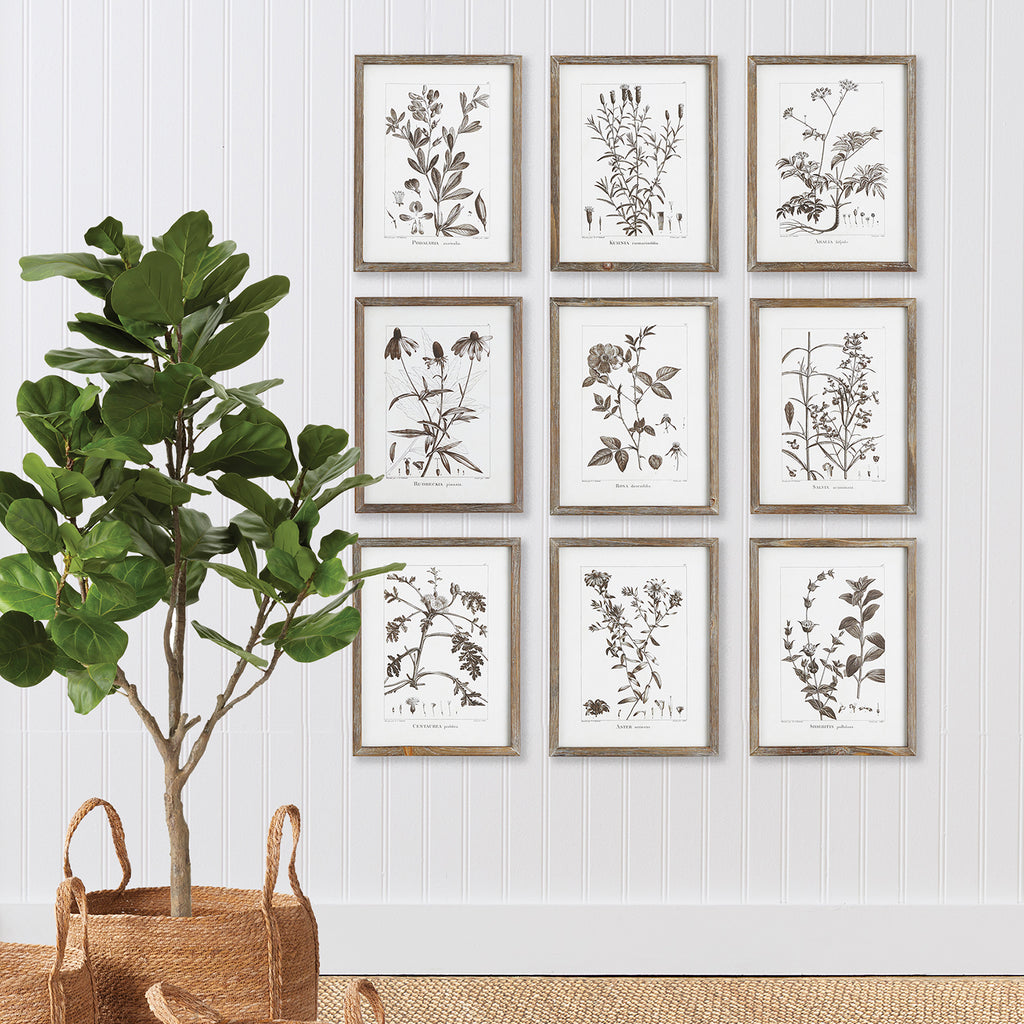 These traditional rustic foliage prints are a warm, dark sepia tone contrasted with a light wood frame. Finished off with real mats, this set of nine is neutral in tone and a stunning choice for home office or study.