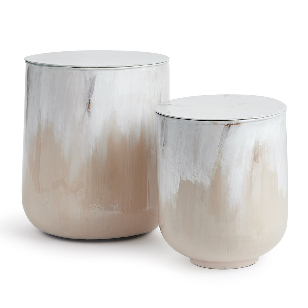 This modern pair of drum tables with removable tops are the perfect storage solution for the cozy space. In a clever use of enameled iron, they are painted by hand. With a creamy mocha palette inspired by a warm latte, with layers of milky froth and coffee tones swirling, it is modern artistry defined.