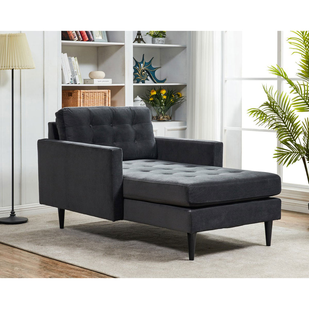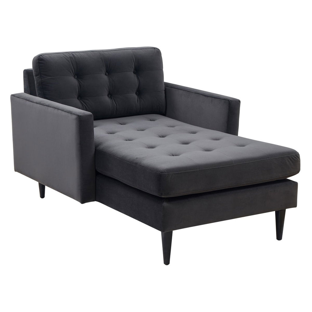This tufted velvet chaise is an undeniable invitation to relaxation in any room. It allows you to lounge in luxury after a long day on your feet surrounded by generously tufted plush velvet, its elongated silhouette perfect for unapologetically stretching out.