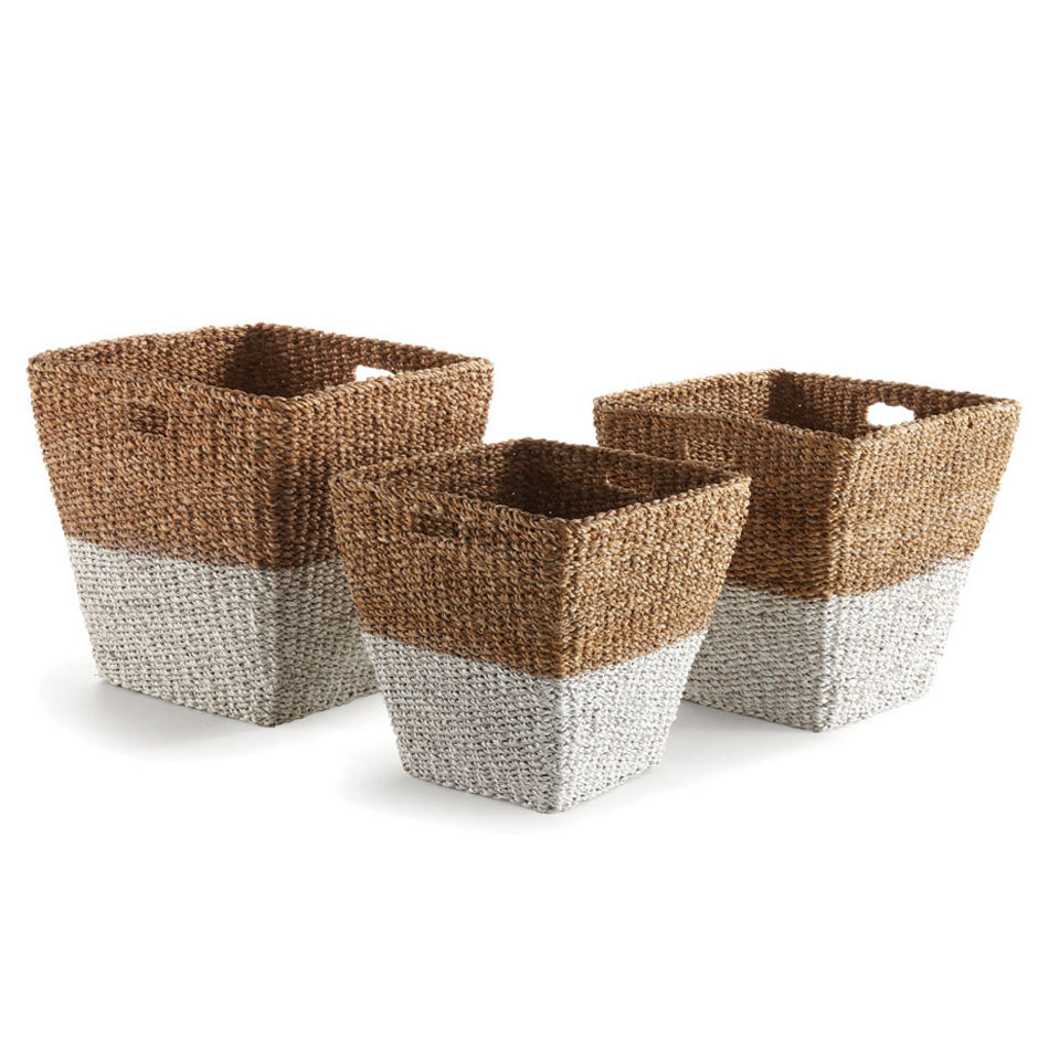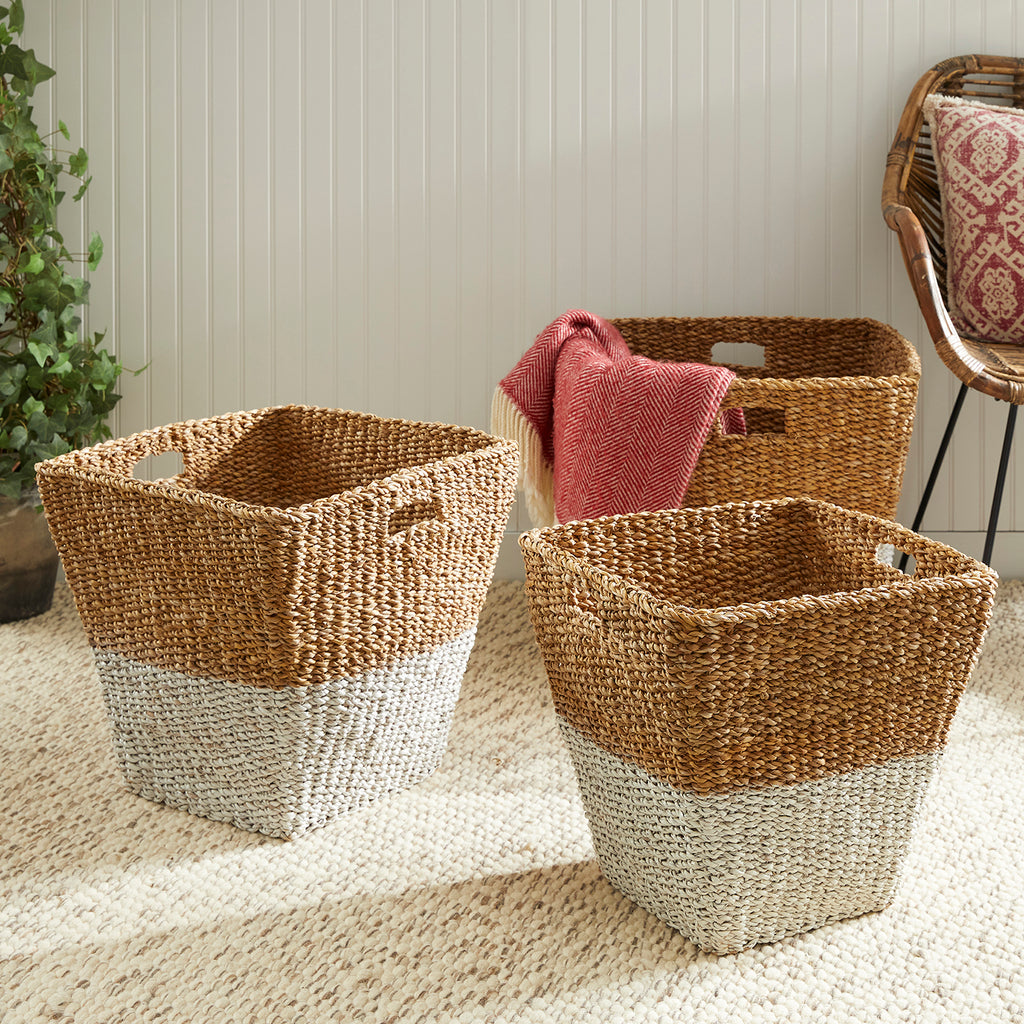 Seagrass is double-walled baskets that are supple, not stiff. Naturally beautiful. These two-toned, substantial set of baskets are ideal for storing heavy items with ease.
