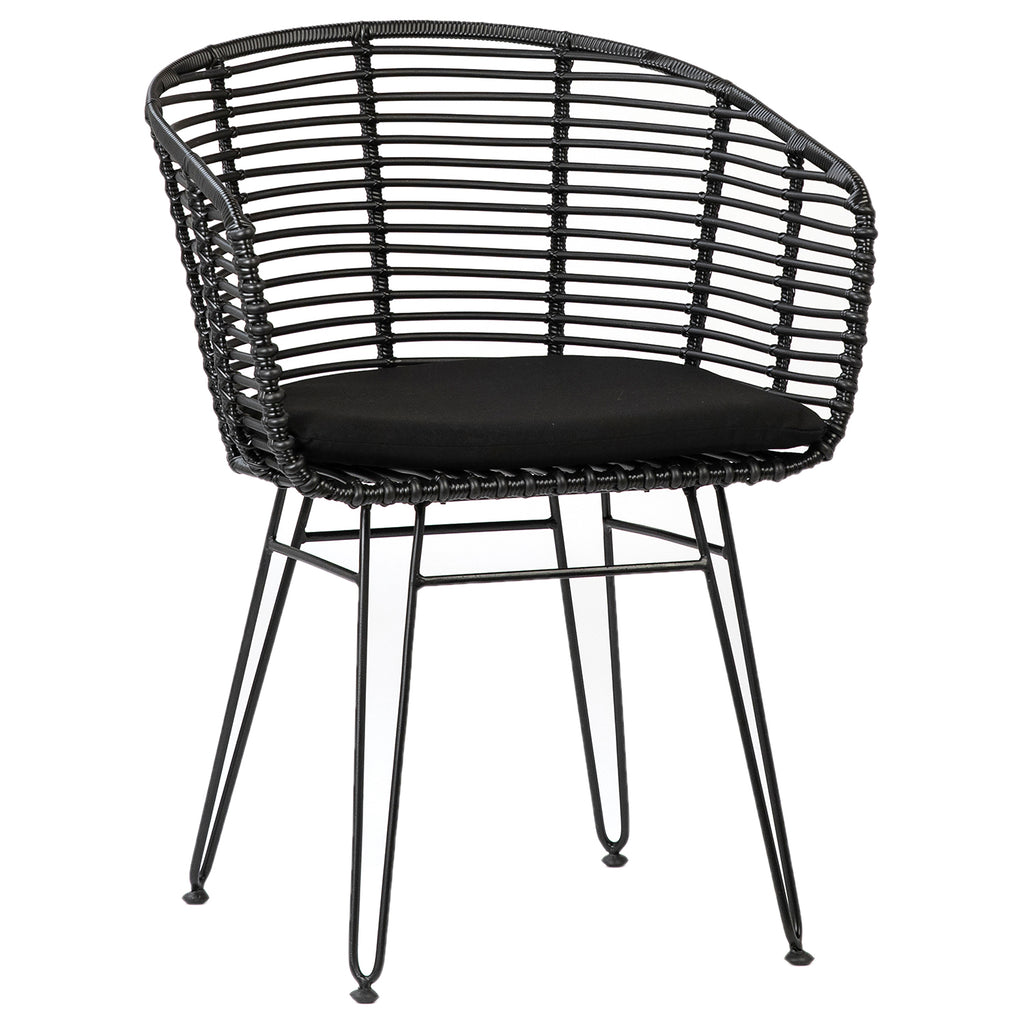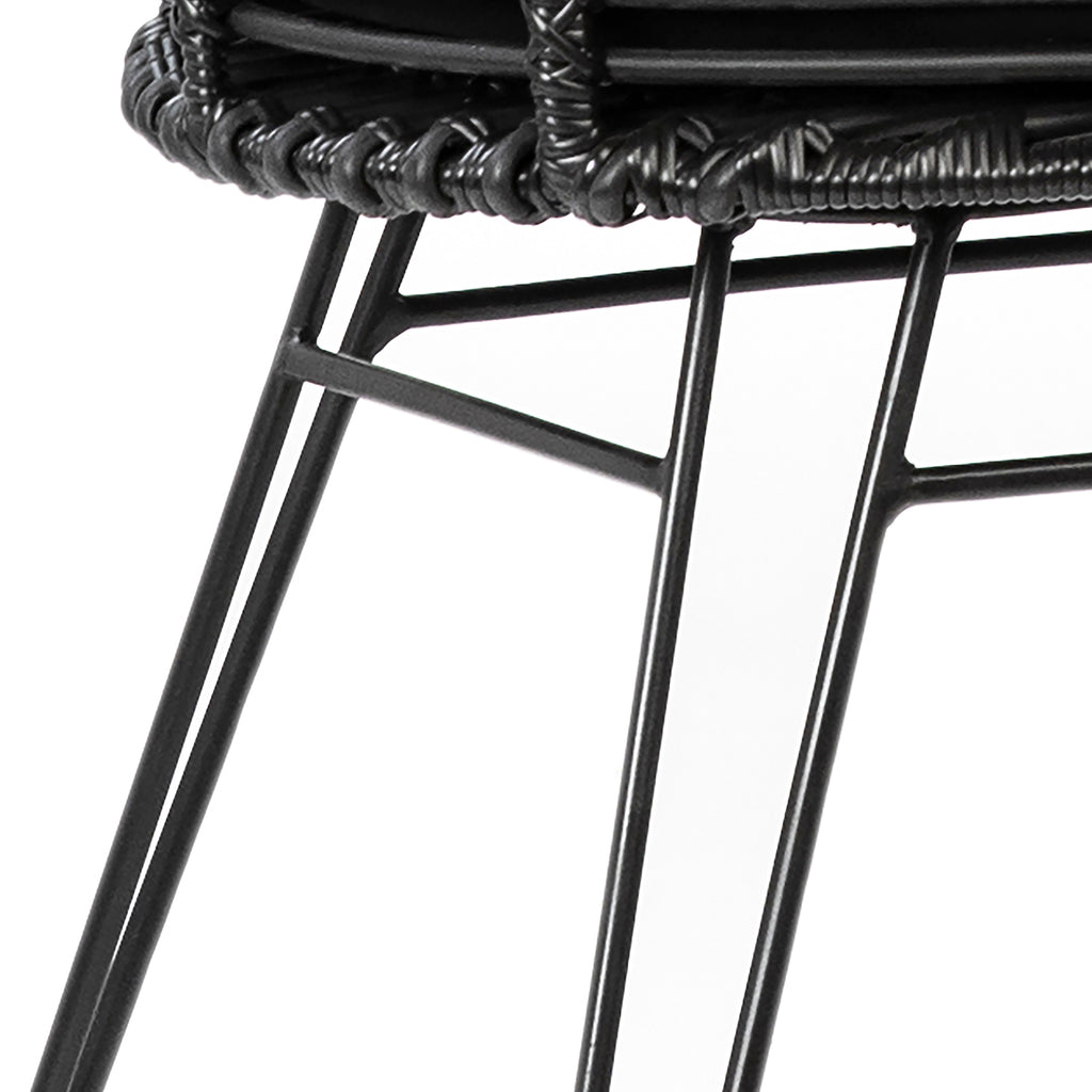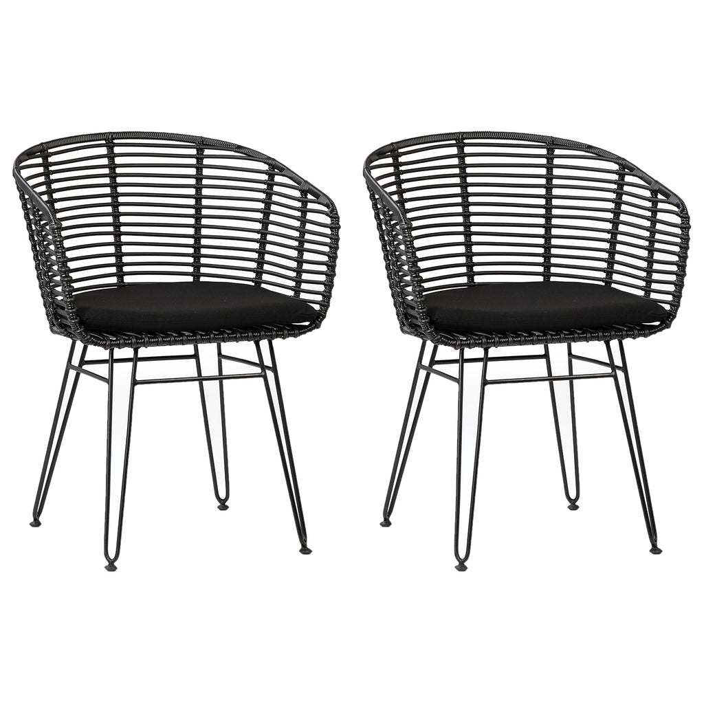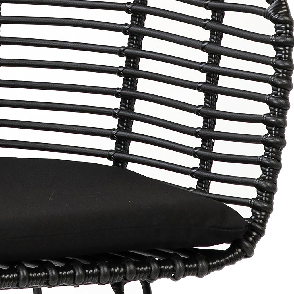 This pair of indoor and outdoor Iron and Synthetic Rattan Bucket chairs come with Outdoor Sunbrella fabric seat cushions with quick dry foam. The woven bucket style back and arms make them perfect for entertaining and lounging. Finished in all black, this set of 2 chairs will fit with any decor.