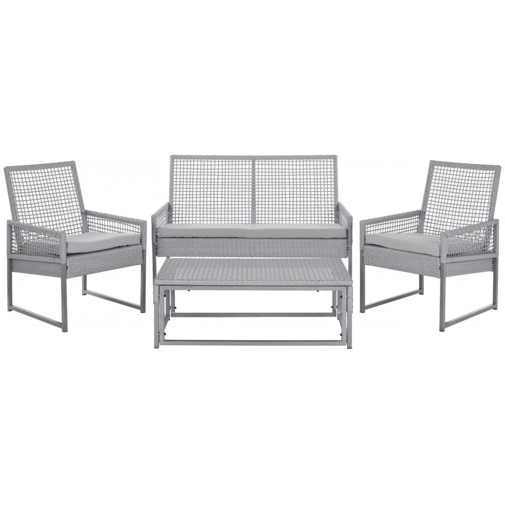 Beautify your outdoor patios and decks for seasons to come with the contemporary Sidings 4-piece outdoor set. With clean transitional lines crafted of rattan aluminum for long wear and stability, and comfy cushions covered in matching grey easy-to-clean Terylene fabric that resists stains, mildew and weather. Chic rattan open mesh chair detailing coordinates with wicker weave for textural interest. Sold as set of 4.