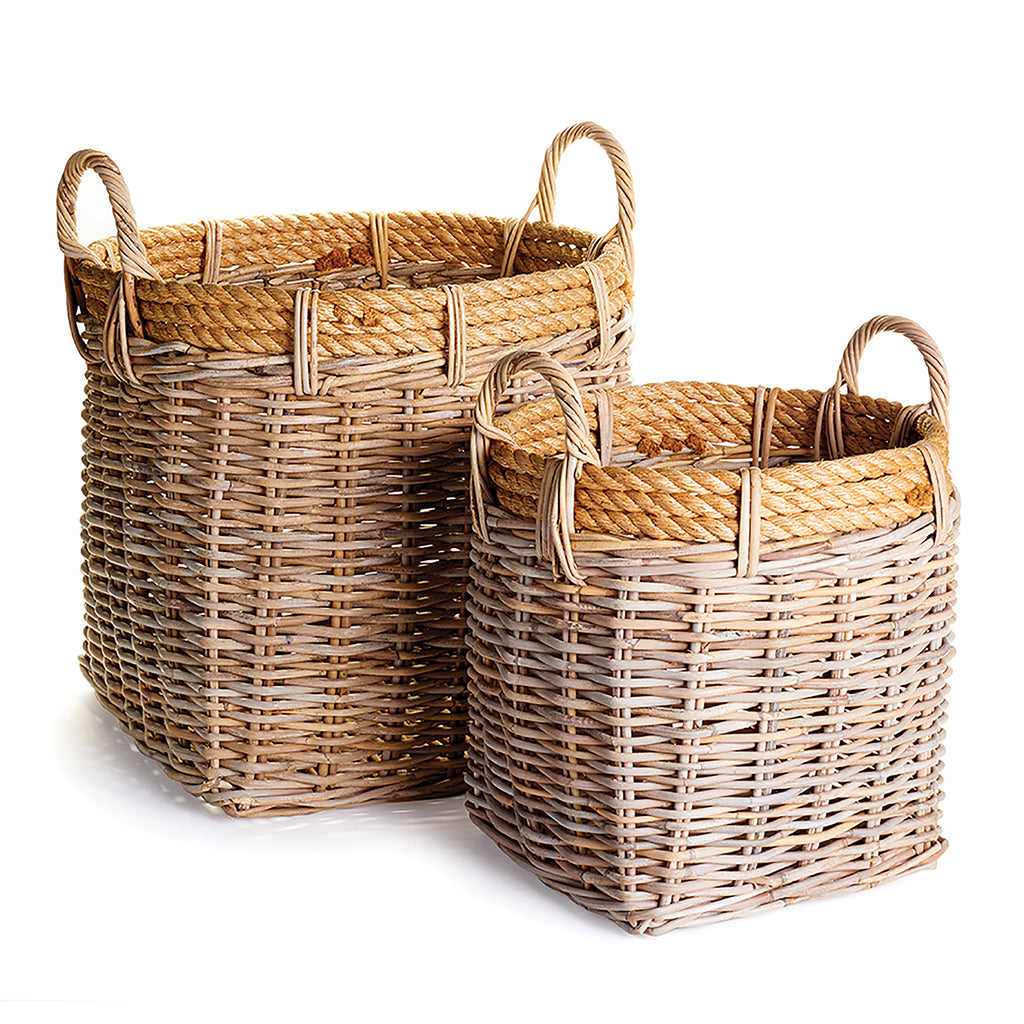 Well-scaled baskets with a fashion-forward rope detail. Use as a laundry baskets, to store dog's toys. These things pretty much hold anything in style.