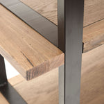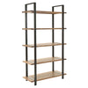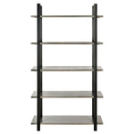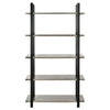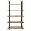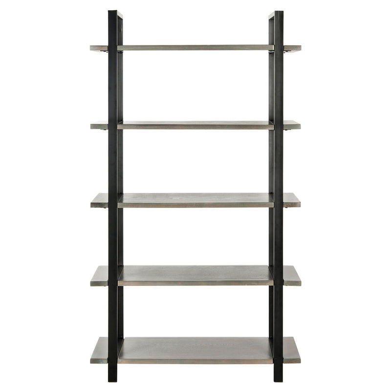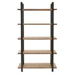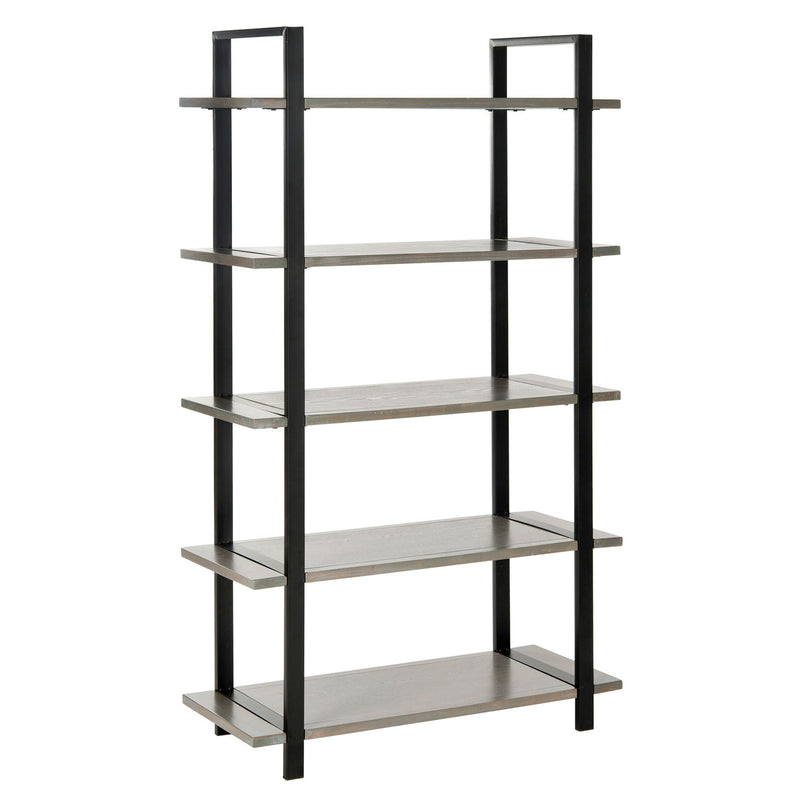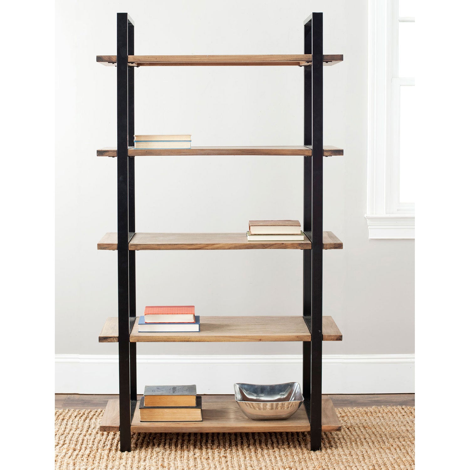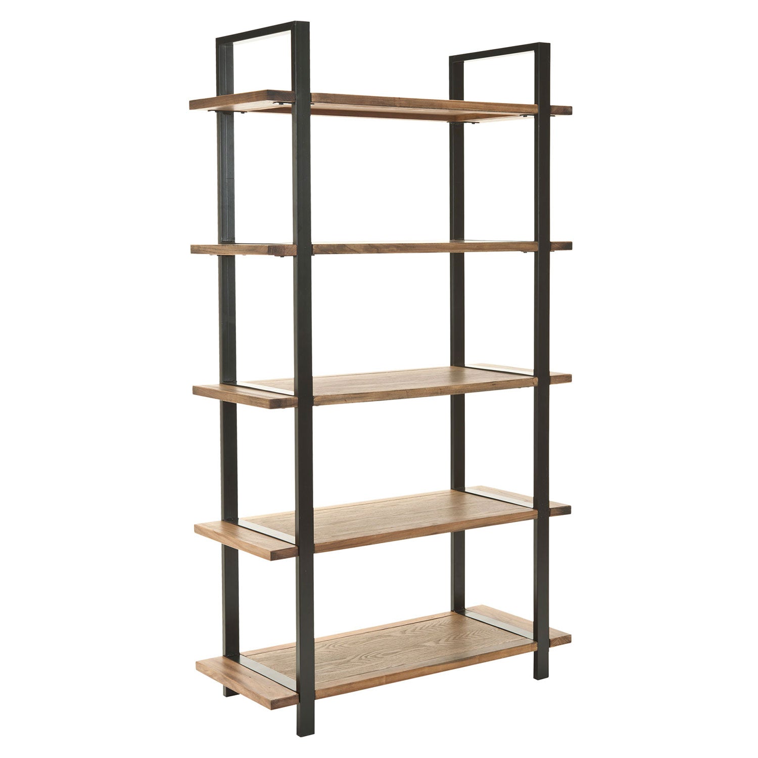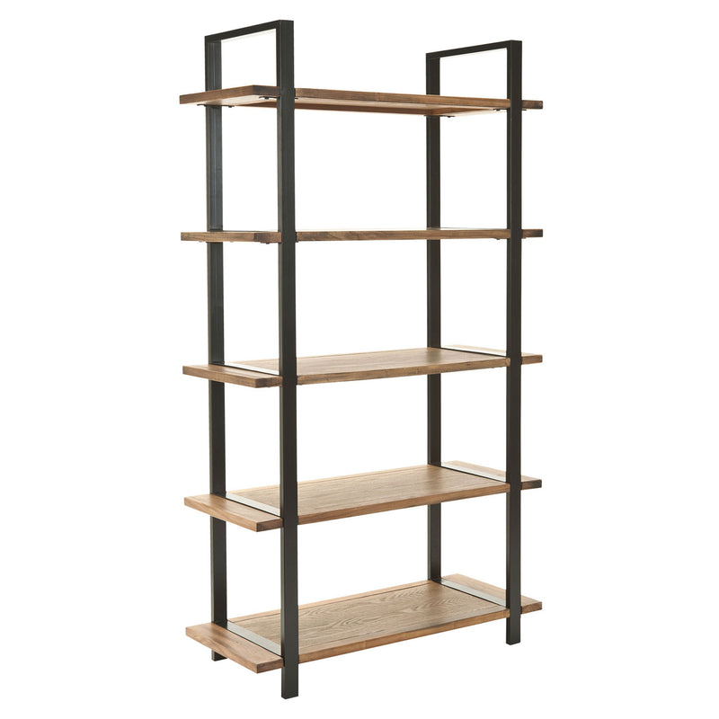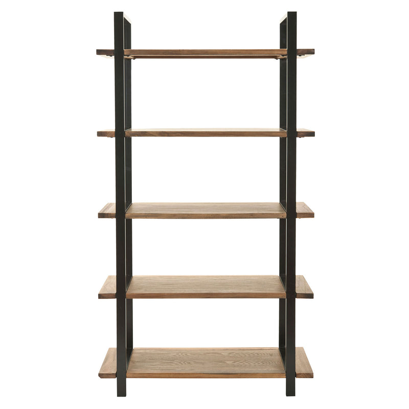 Industrial and contemporary, this étagère boasts brown-toned elm shelves that seem to float on wrap-around frames of dark metal. Ideal for any room in the home and perfect for the office, this sophisticated piece makes a statement on its own and a dramatic architectural look in pairs. Use the Scott étagère to store favorite books and curios in style.