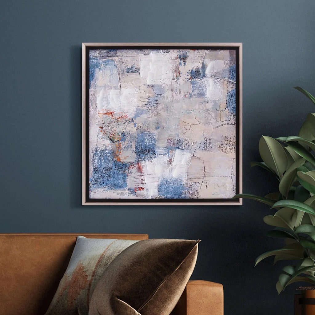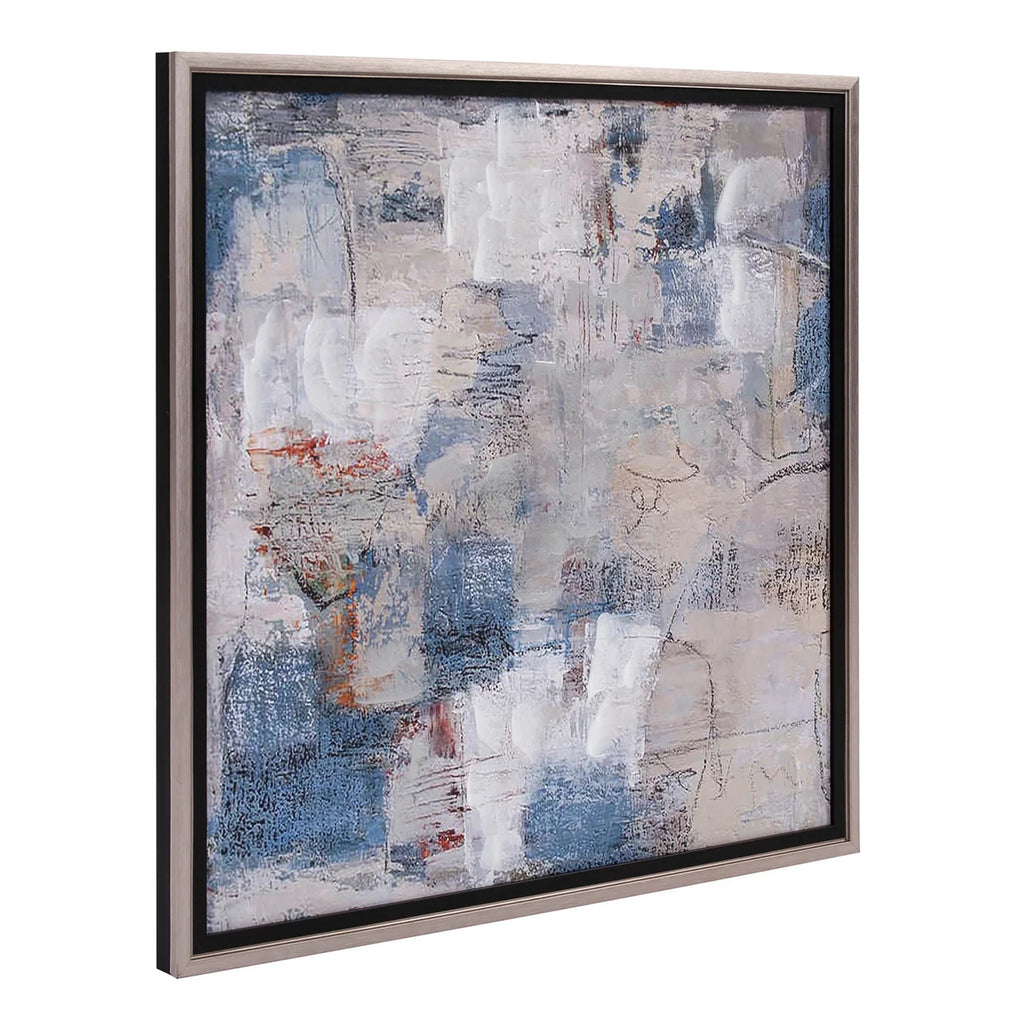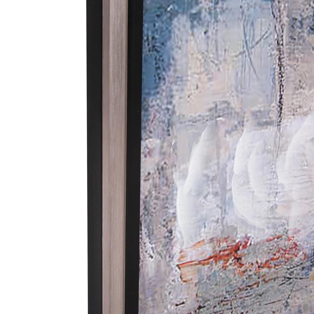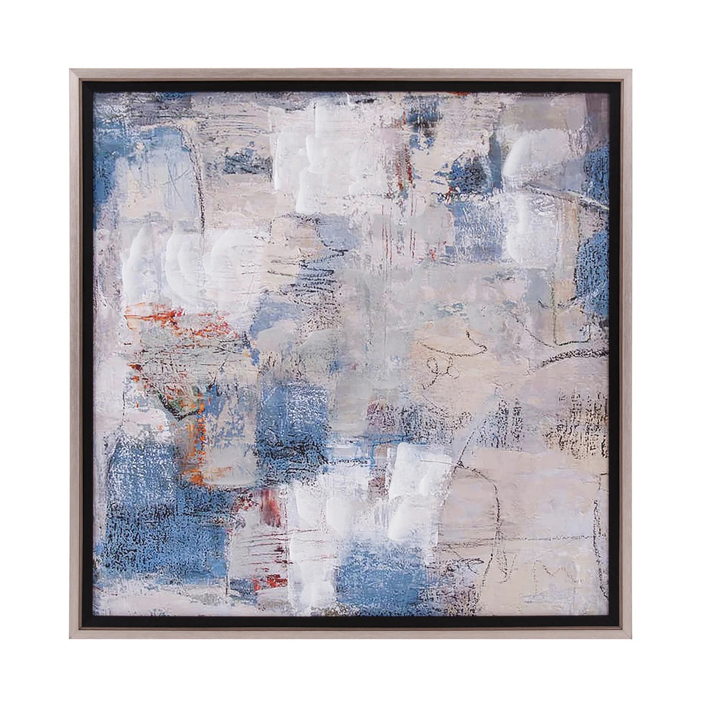 I love the distorted textures and colors that water provides me as inspiration. As I sat on the street in a cafe, I noticed the uneven stones had collected water and as people splashed their way through colors of the cafe’s awning danced along with the hustle of the city. This became a source for an abstract painting entitled “The Splash”. Each of these pieces are embellished by hand with touches of giclee to highlight and add texture to each canvas.