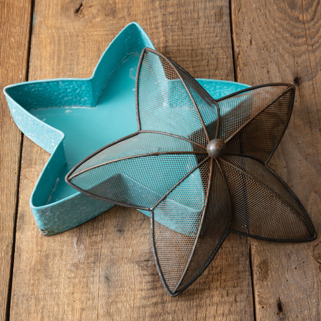 Organize small items in this starfish tray such as collected seashells or place alone on your table for a coastal touch. The tray is made of metal and the lid is fashioned in a sifter metal wire design. It will make you feel like you are at home with the ocean.