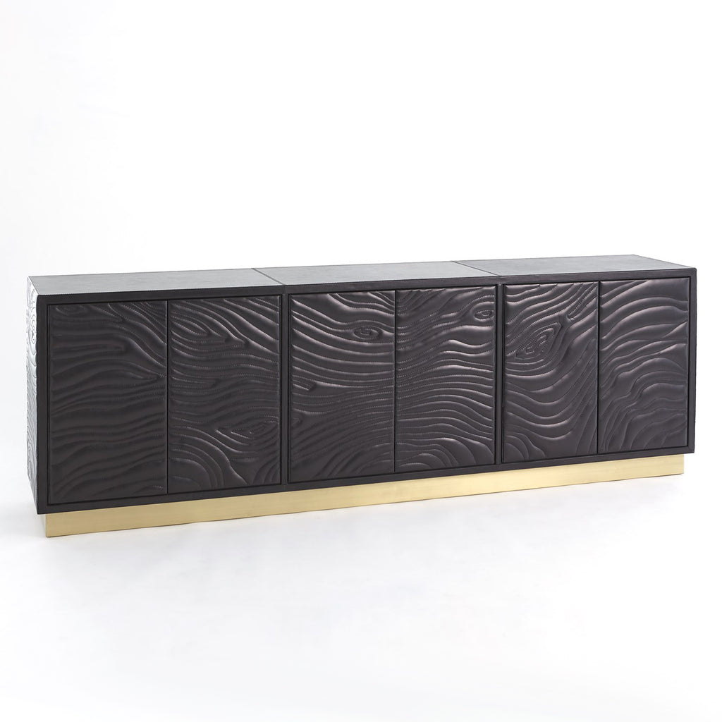 Enveloped in hand-dyed charcoal leather, the stunning Forest Long Cabinet earns its name with distinctive faux bois-patterned quilting on each of its six door fronts. A sleek plinth base in an antique satin gold finish grounds the piece beautifully, while a velvety poly suede-lined interior adds a perfectly polished finishing touch. Behind the touch-latch doors are three separate interior compartments, each containing a shelf and a brass grommet for easy media access.