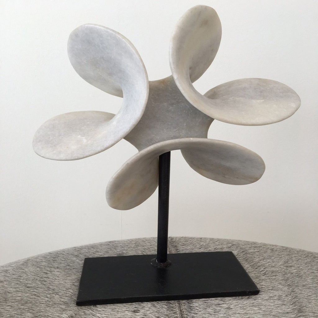 The Studia A Pankhudee sculpture on stand is a stylized contemporary marble flowers could almost double as pinwheels--especially when mounted on an iron stand. Hand carved from white ambaji marble by Indian artisans.