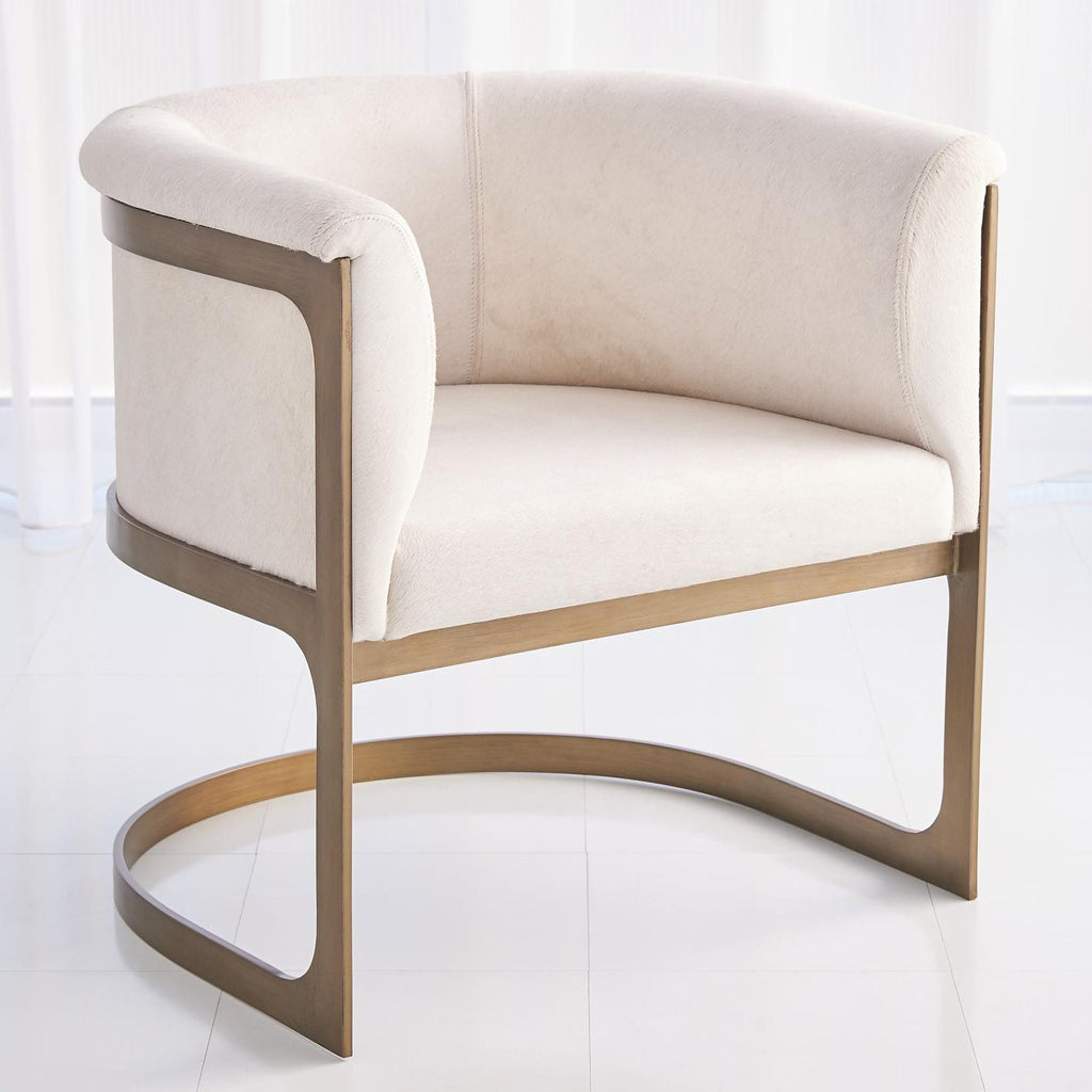 The Regan Barrel Chair offers a modern take on old Hollywood glam. Luxe ivory hair-on-hide covers a form-fitting seat and back, both wrapped and suspended in an antique brass-finished solid iron cantilever base.