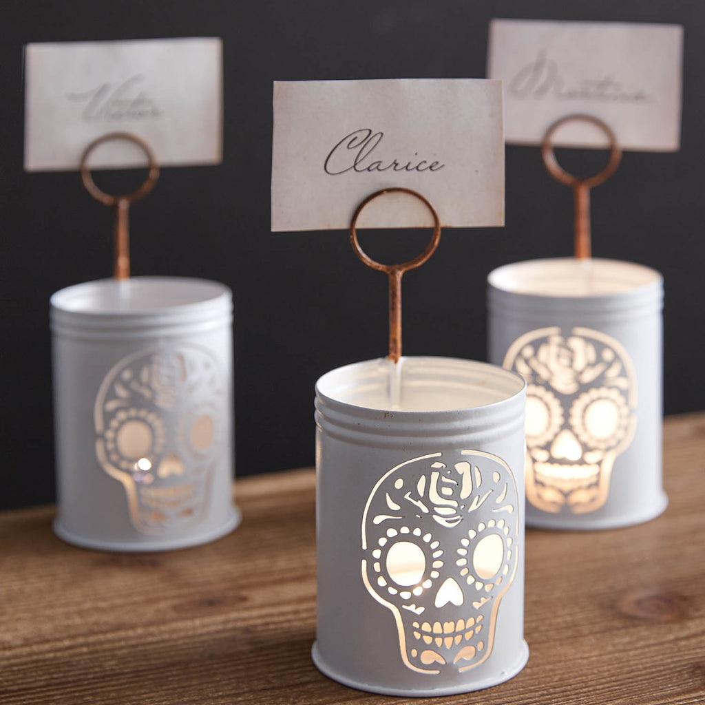 These unique place card holders enhance a table setting and make dinner time fun. Use our Sugar Skull Luminary Place Card Holder for Halloween parties and dinners. Place a LED tealight inside to create a luminary or fill it with candy for your guests.