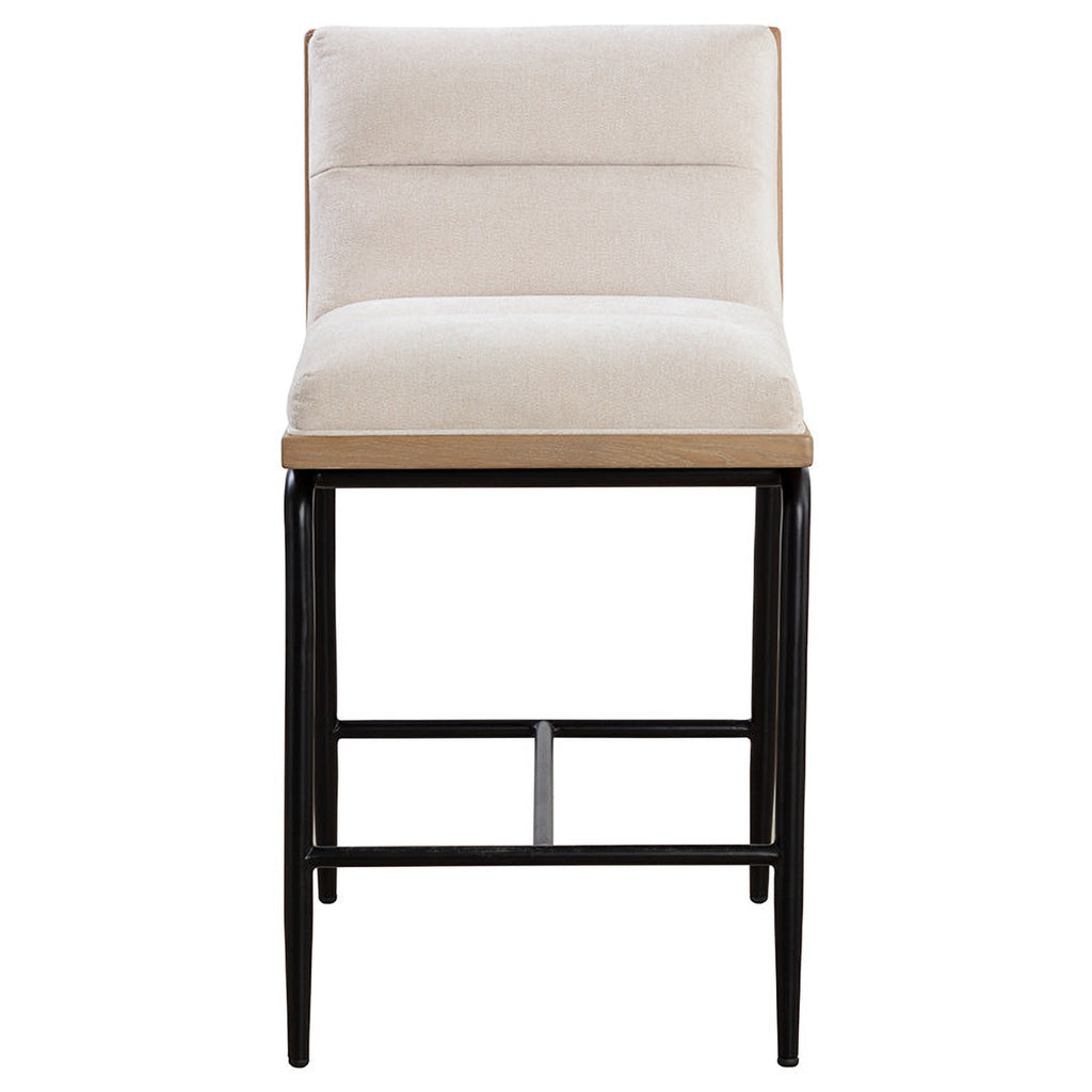 Plush seating and a simple frame make the Abilene Counter Stool versatile and incredibly comfortable. A mixed material seat features our polo club muslin performance fabric on top of a rustic oak wood frame. Paper rope detailing at the back of the chair gives an understated coastal influence while also acting as a functional handle. Powder-coated matte black legs contrast with the light-coloured materials. As wood is an organic, porous material, these pieces will contain natural variation of texture and may also exhibit fine indentations and cracks. Wood pieces will also display a disparity of colour and grain, and visible knots and burls that add to the character of each piece. Due to the natural contents of natural paper rope, it is advised to minimize contact with strongly dyed fabrics to avoid discolouration and/or colour transfer.