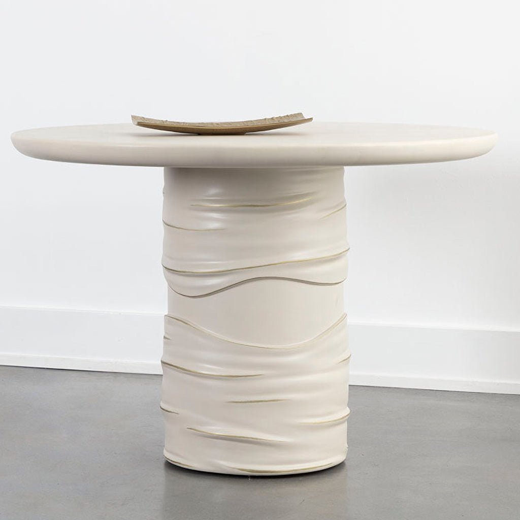 Inspired by the opulence of classical design, the Alanya Dining Table is reminiscent of a piece of art. Constructed from cream-coloured glass fibre-reinforced sealed concrete with curved ridges on the base. Hand painted brass accents give this piece a distinctive look.